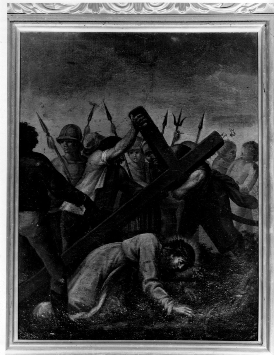 Personaggi: Cristo. Figure maschili: soldati; carnefici. Oggetti: croce; corona di spine. Armi: lance