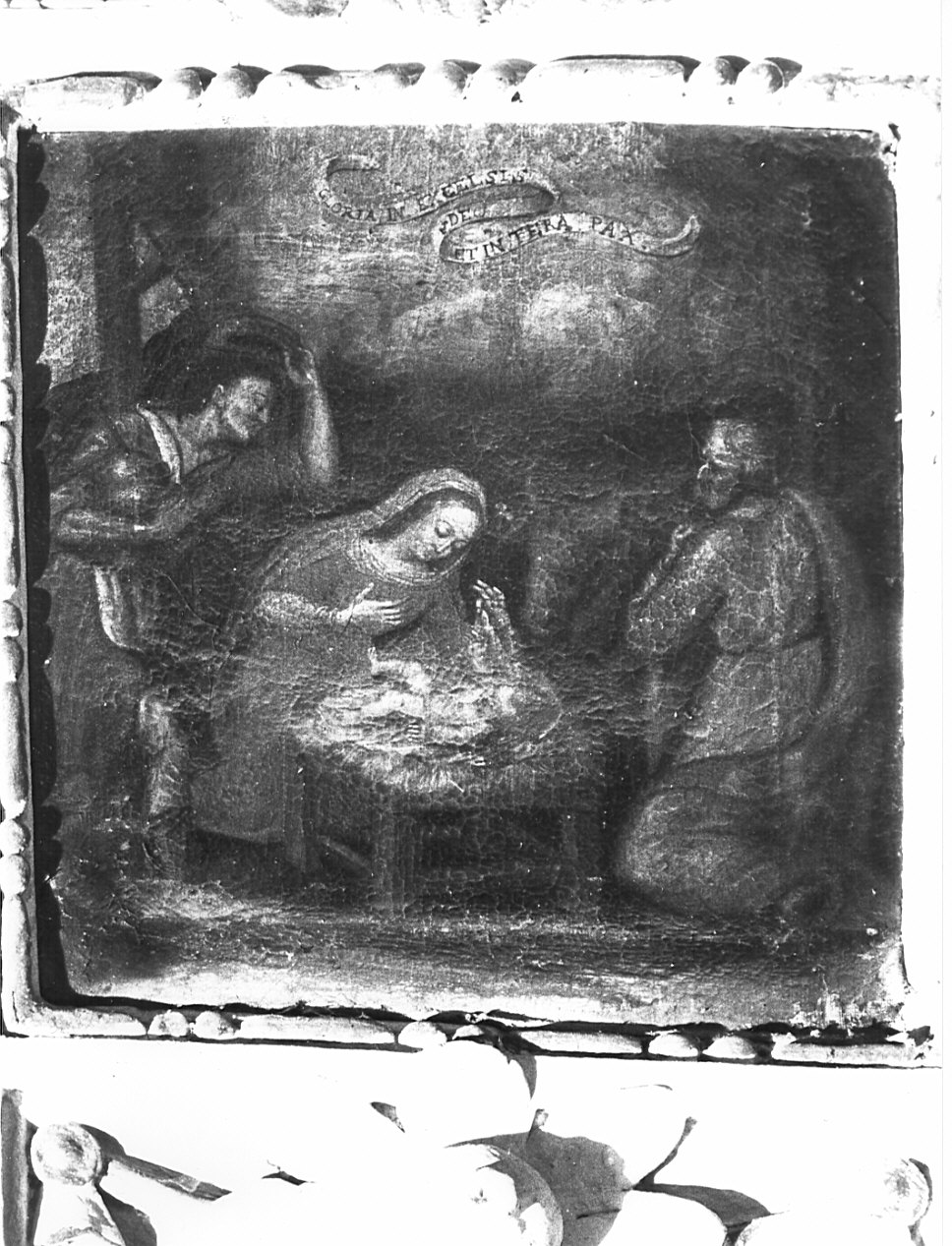 Personaggi: Madonna; Cristo Bambino; San Giuseppe. Figure maschili: pastore. Oggetti: mangiatoia; cartiglio