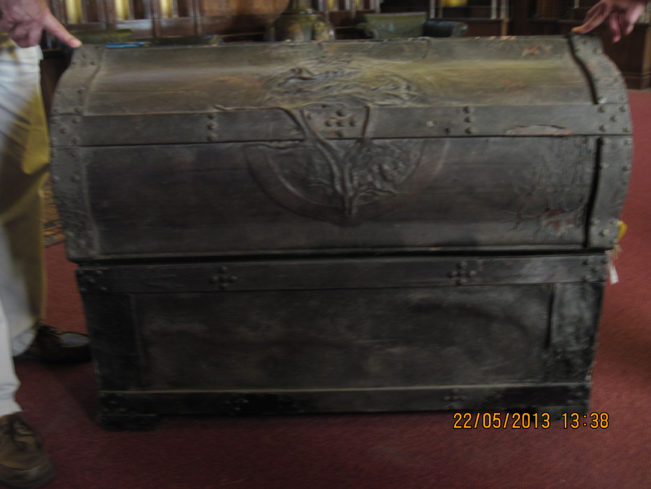 Baule in cuoio impresso con anima in legno e borchie in ferro. Sul lato interno del coperchio è rappresentato lo stemma del Principe Montenevoso