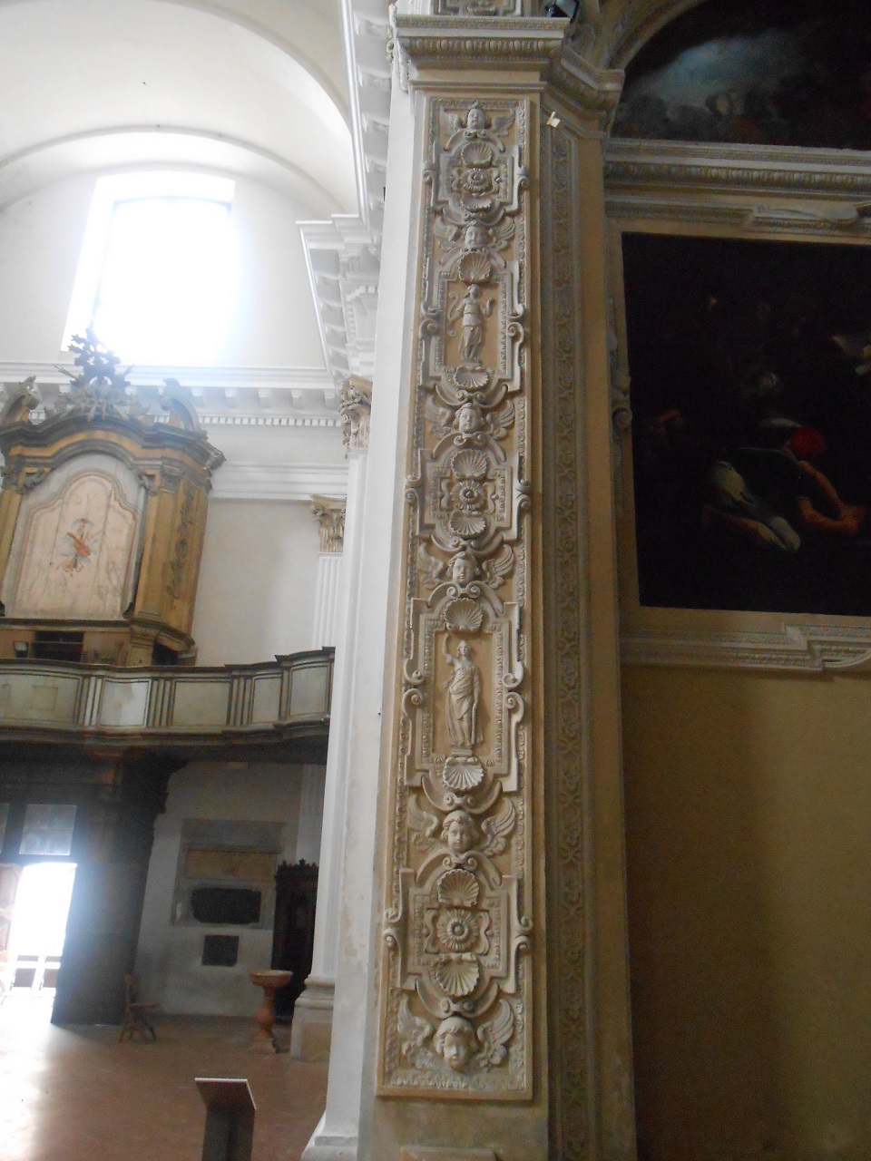 Nell'arco d'ingresso della cappella si ripete un modulo formato da tabelle mistilinee che, segnate da conchiglie, sono comprese tra teste d'angelo. Racchiudono figure femminili alternate a rosette. Tale decorazione modulare ritorna nelle lesene della parete di fondo, mentre nelle pareti laterali le lesene presentano motivi floreali avvolti a spirale. La cupola è scandita da festoni carichi di frutti e nastri, alla base della lanterna gira una fascia di teste d'angelo. Nei pennacchi un cartiglio mistilineo