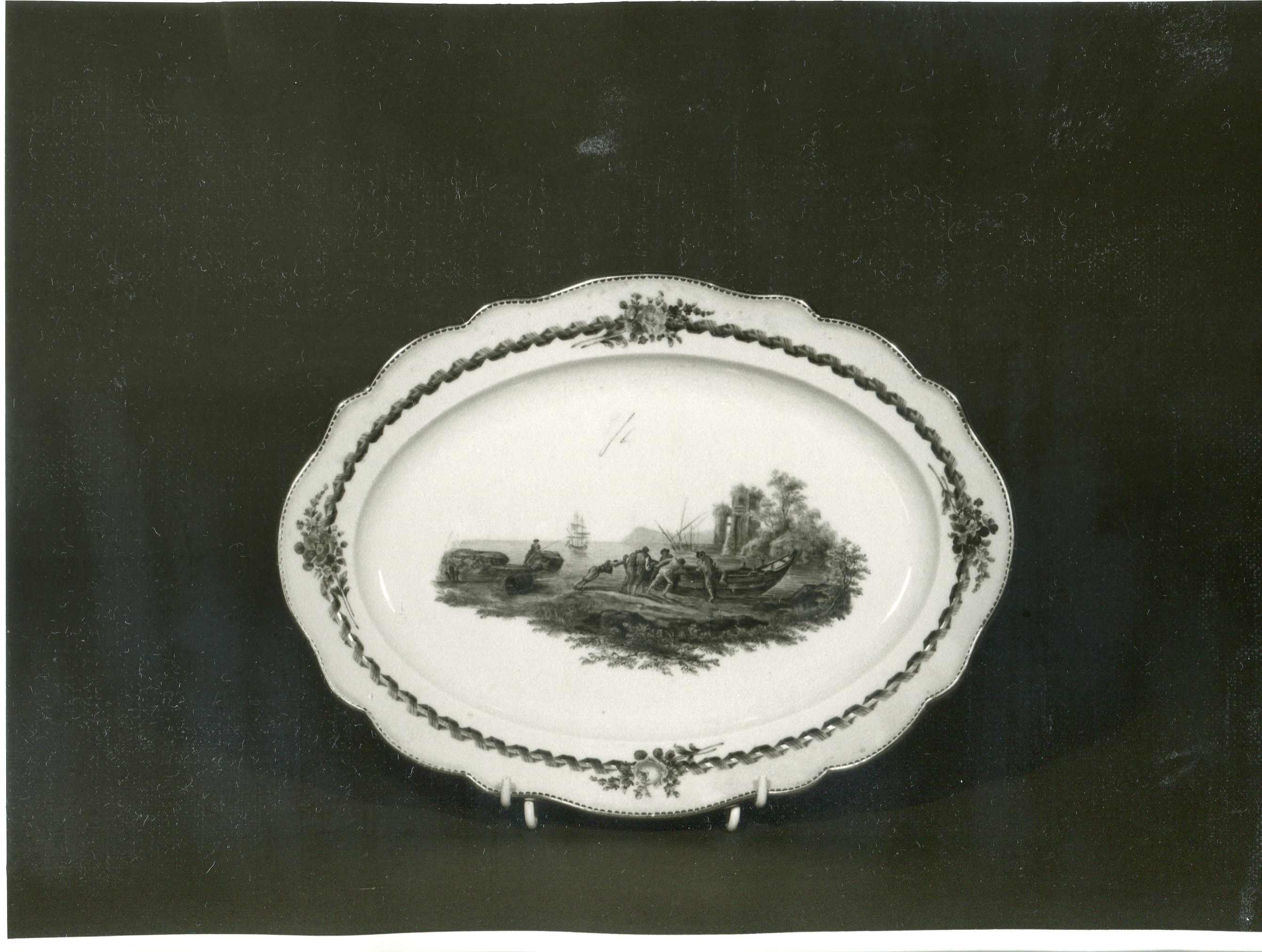 Vassoio con raffigurazione di un paesaggio marino con barche, velieri, rovine e pescatori. La scena dipinta è inserita entro una cornice con motivo decorativo a nastro e floreali. Decorazione eseguita con smalti policromi