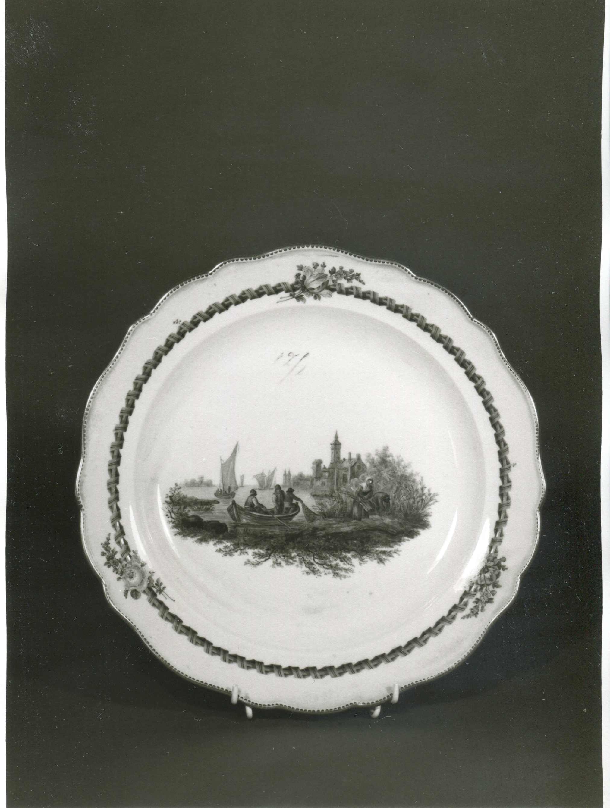 Piatto di servizio: al centro una raffigurazione con paesaggio fluviale con velieri, barca con pescatori che ritirano le reti e donne che raccolgono giunchi. La raffigurazione è inserita entro una cornice con motivo decorativo a nastro e floreali. Decorazione eseguita con smalti policromi