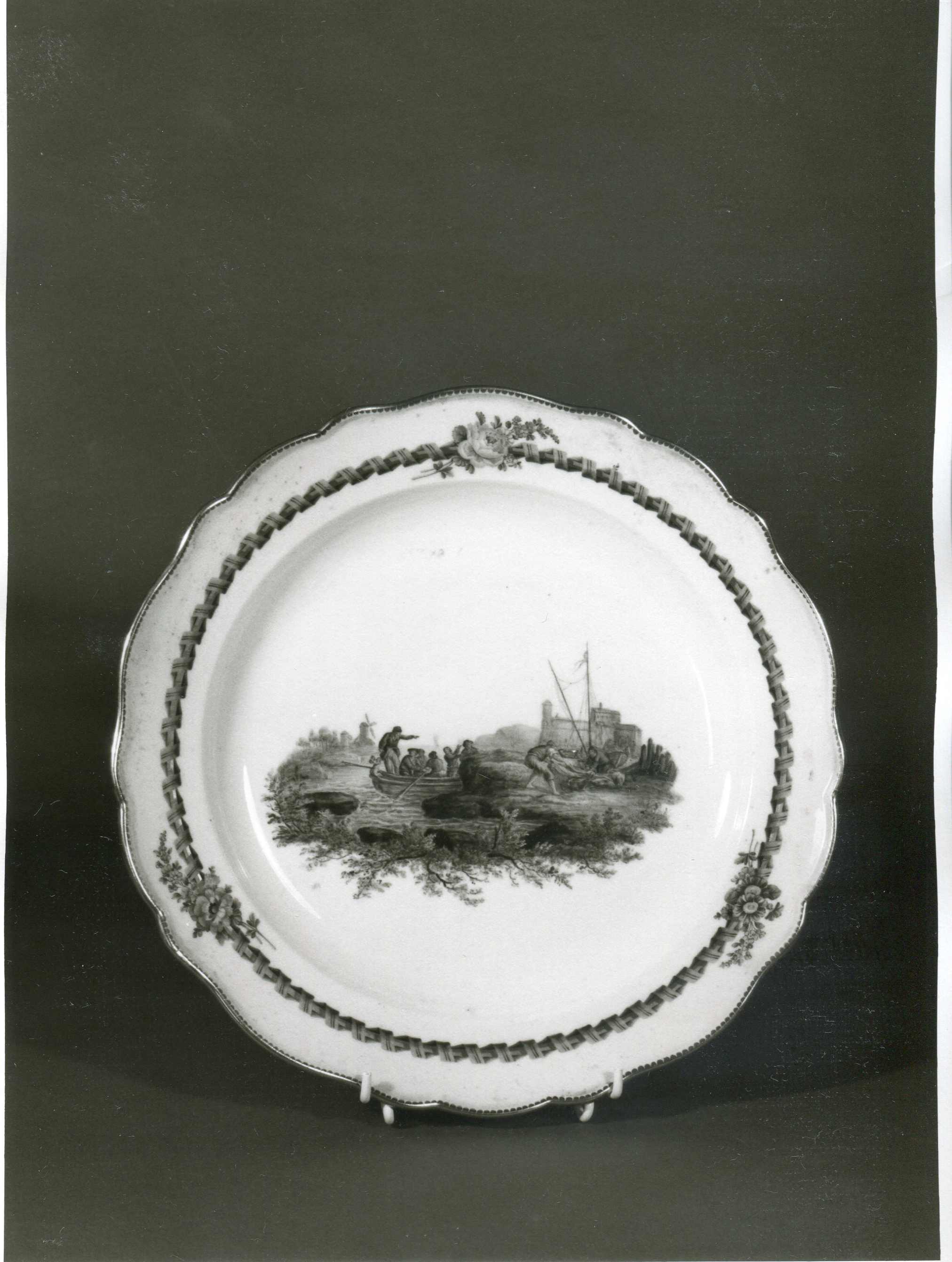 Piatto di servizio: al centro una raffigurazione con paesaggio fluviale con barca e pescatori al lavoro. La raffigurazione è inserita entro una cornice con motivo decorativo a nastro e floreali. Decorazione eseguita con smalti policromi
