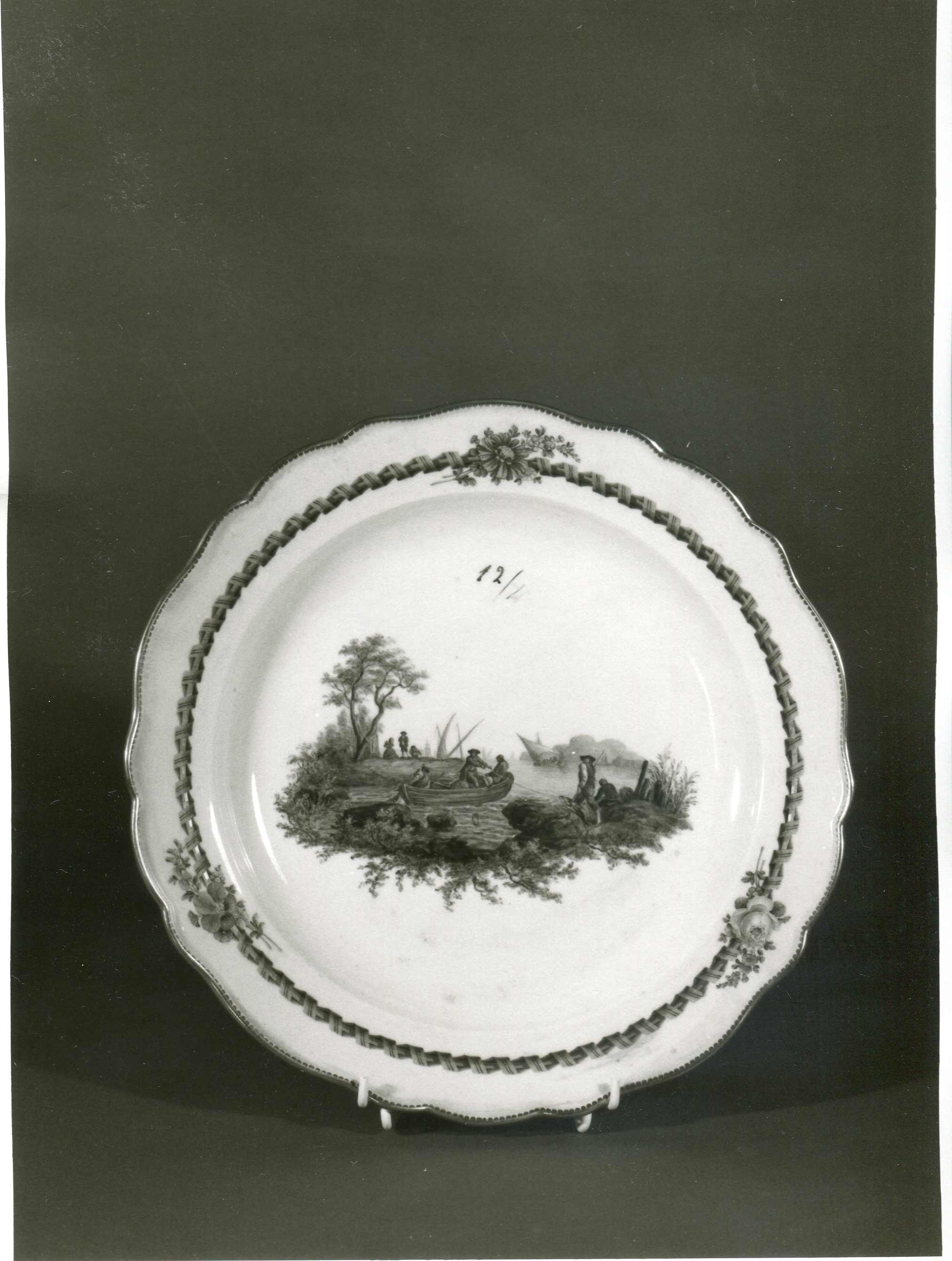 Piatto di servizio: al centro una raffigurazione con paesaggio fluviale con velieri, barche e pescatori. La raffigurazione è inserita entro una cornice con motivo decorativo a nastro e floreali. Decorazione eseguita con smalti policromi