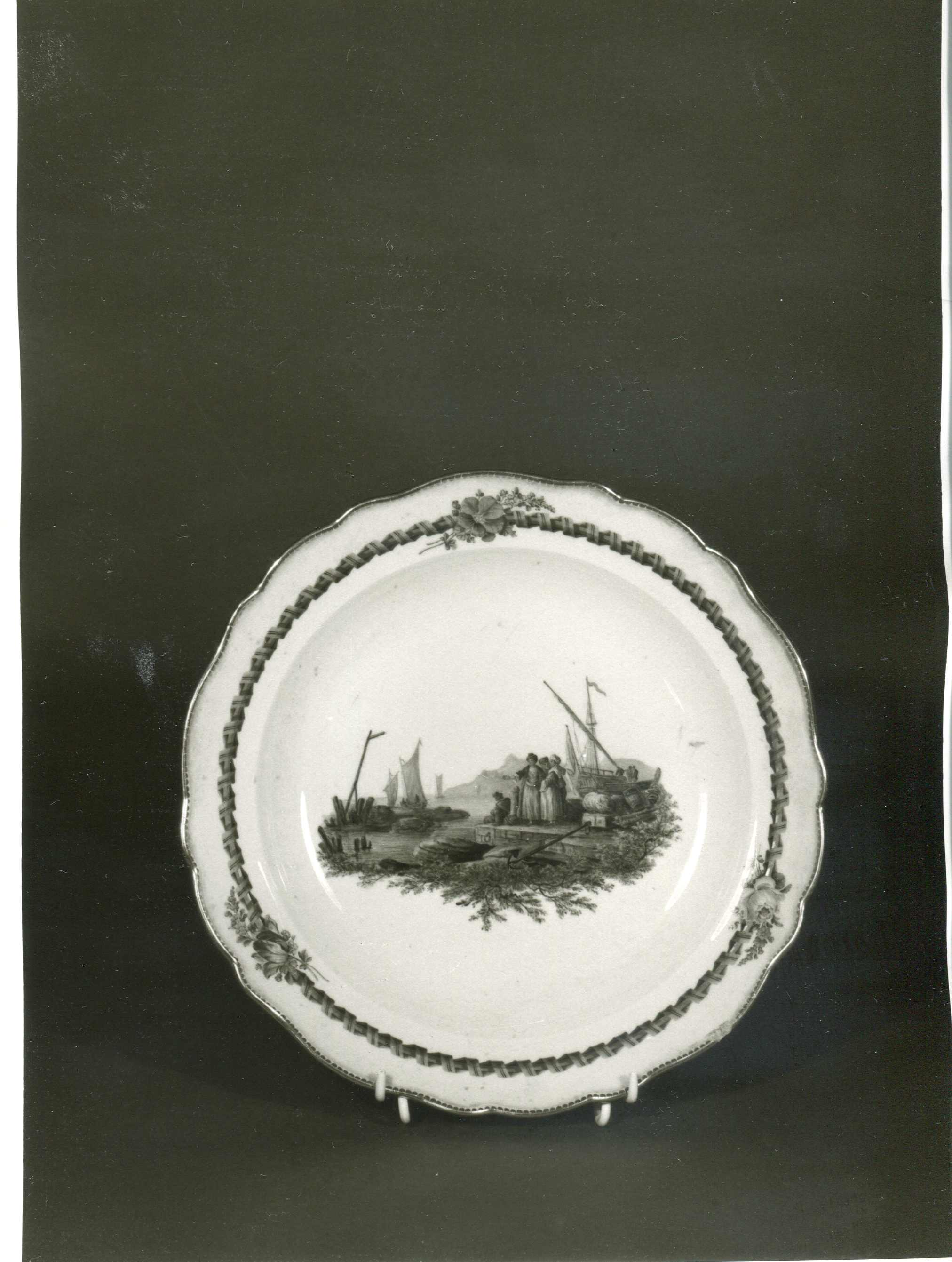 Piatto di servizio: al centro una raffigurazione con approdo con velieri, persone e merci. La raffigurazione è inserite entro una cornice con motivo decorativo a nastro e floreali. Decorazione eseguita con smalti policromi