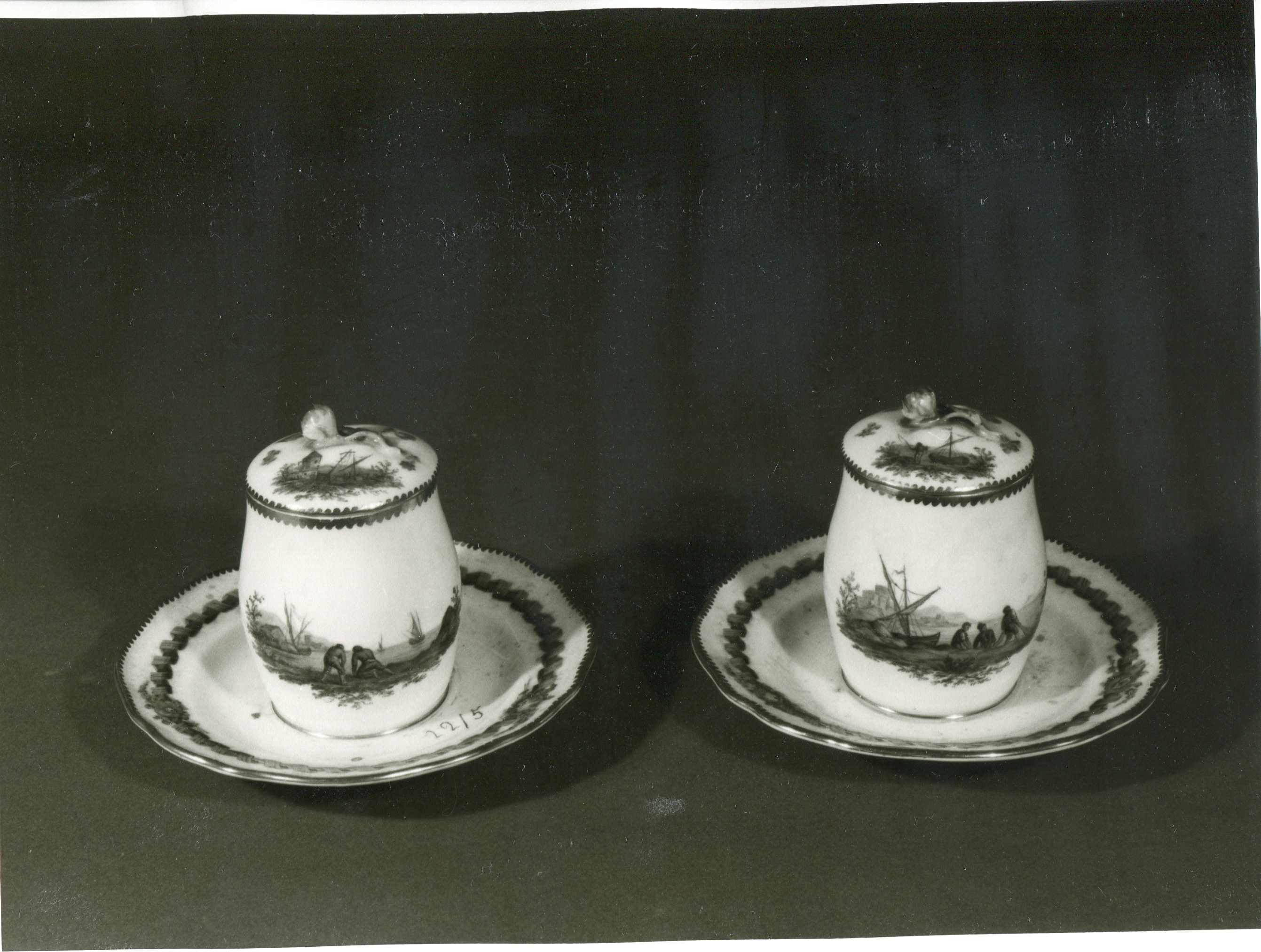Due senapiere: raffigurazioni con paesaggi marini animati da persone al lavoro, barche e velieri. Decorazione eseguita con smalti policromi