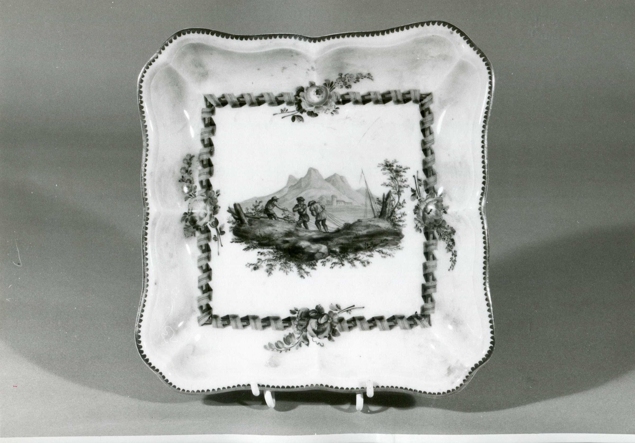Piatto di servizio: al centro una raffigurazione con marina e pescatori. La raffigurazione è inserita entro una cornice con motivo decorativo a nastro e floreali. Decorazione eseguita con smalti policromi