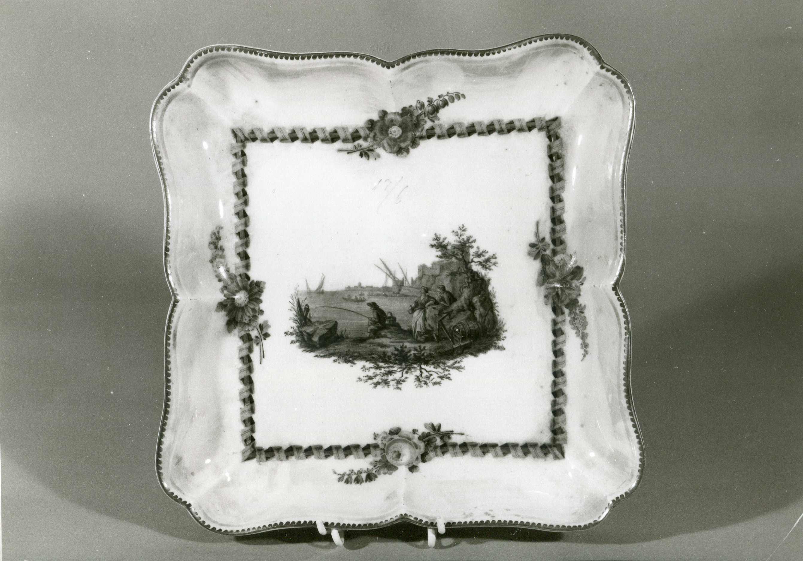 Piatto di servizio: al centro una raffigurazione con scena campestre e figure. Sullo sfondo, marina con velieri. La raffigurazione è inserita entro una cornice con motivo decorativo a nastro e floreali. Decorazione eseguita con smalti policromi