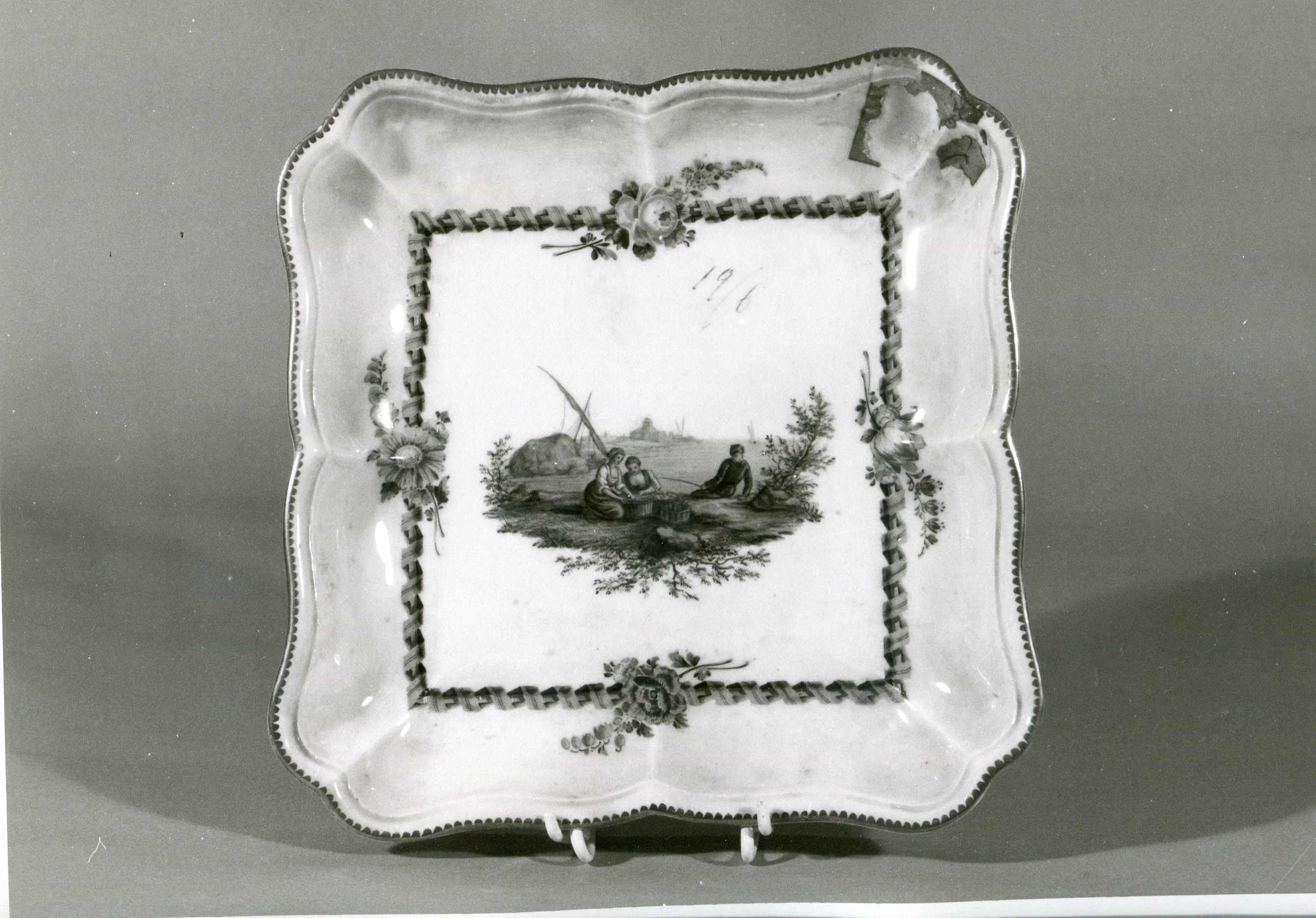 Piatto di servizio: al centro una raffigurazione con scena campestre. Sullo sfondo, marina con velieri. La raffigurazione è inserita entro una cornice con motivo decorativo a nastro e floreali. Decorazione eseguita con smalti policromi