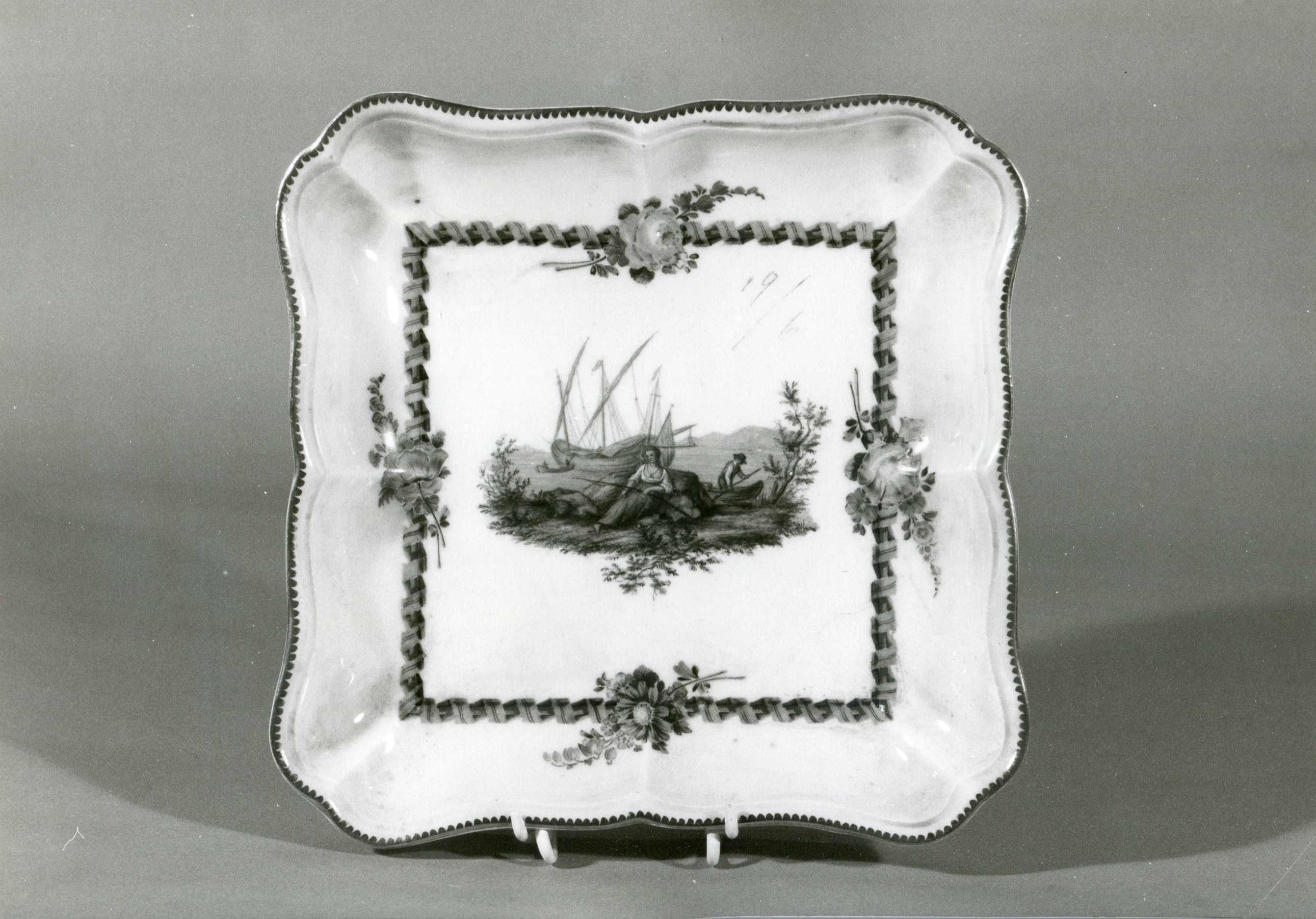 Piatto di servizio: al centro una raffigurazione con paesaggio marino e figure. La raffigurazione è inserita entro una cornice con motivo decorativo a nastro e floreali. Decorazione eseguita con smalti policromi