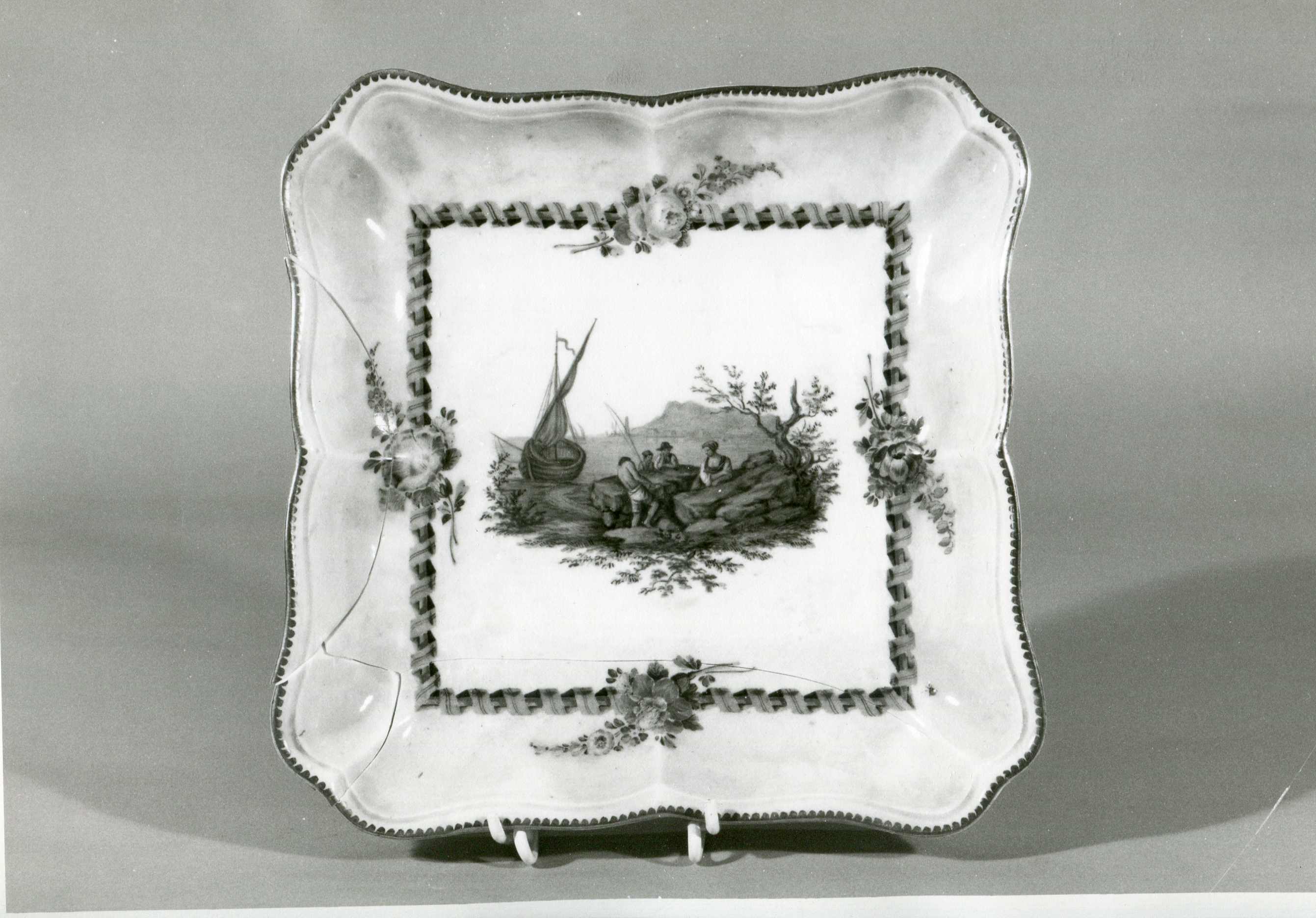 Piatto di servizio: al centro una raffigurazione con paesaggio marino e pescatori. La raffigurazione è inserita entro una cornice con motivo decorativo a nastro e floreali. Decorazione eseguita con smalti policromi