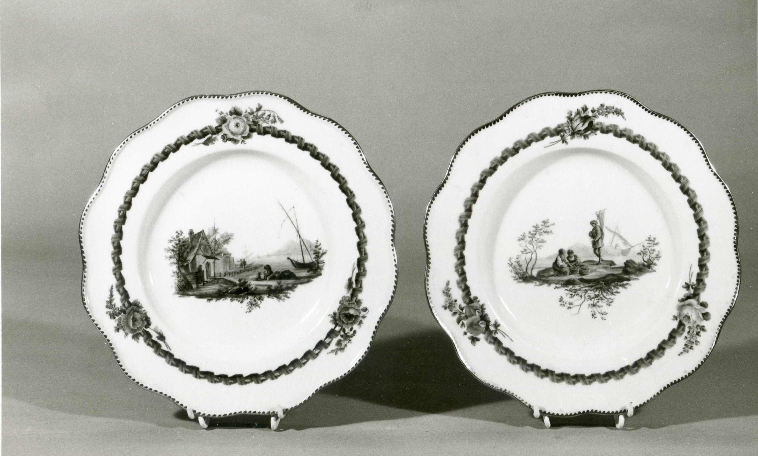 Sul primo piatto è raffigurato un paesaggio marino con casa, nave e figure; sul secondo piatto compare un paesaggio marino con nave, lavandaie e pescatore. Le raffigurazioni sono inserite entro una cornice con motivo decorativo a nastro e floreali