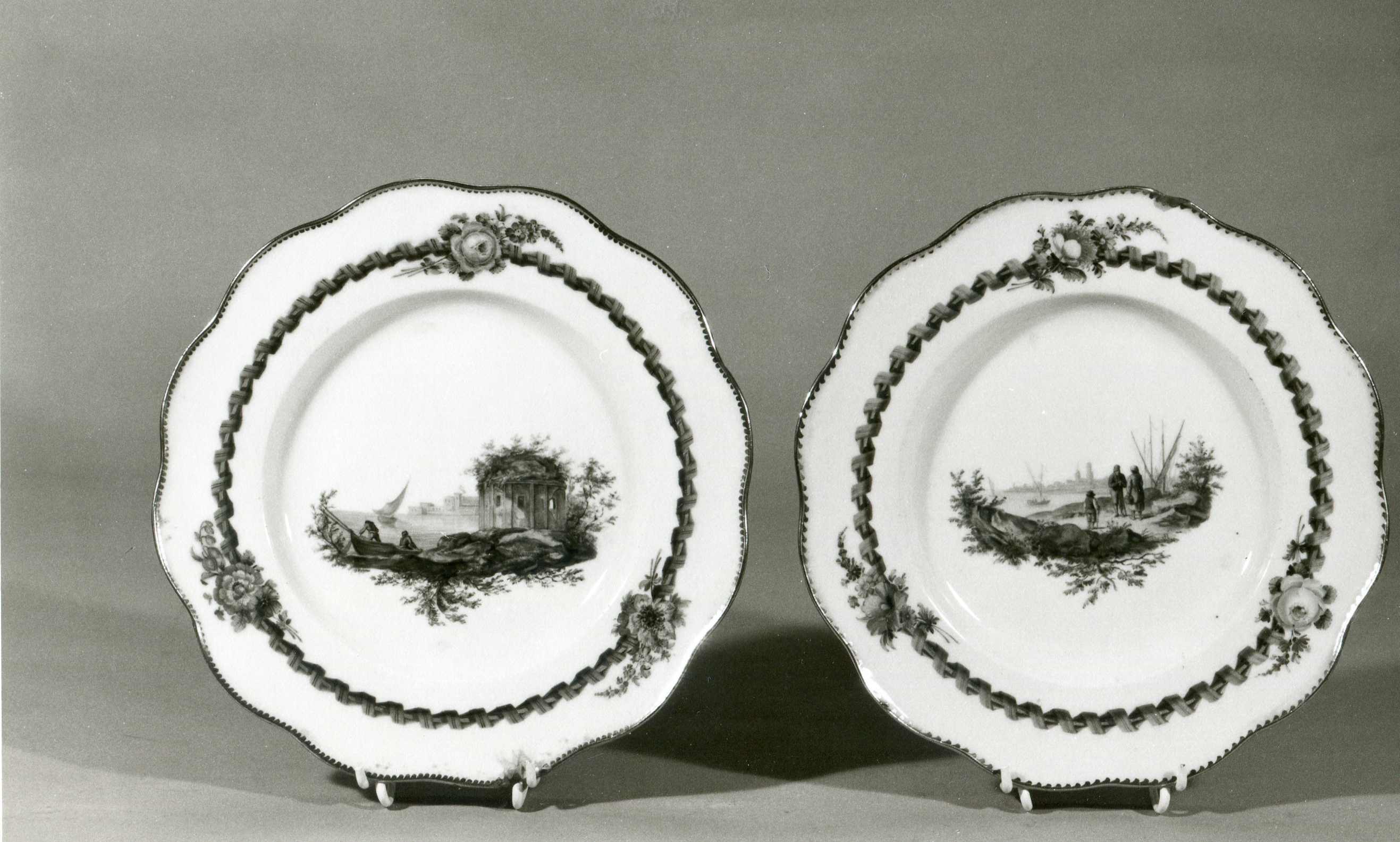 Sul primo piatto è raffigurato un paesaggio marino con navi, pescatori e rovine; sul secondo piatto compare un paesaggio marino con navi e figure. Le raffigurazioni sono inserite entro una cornice con motivo decorativo a nastro e floreali