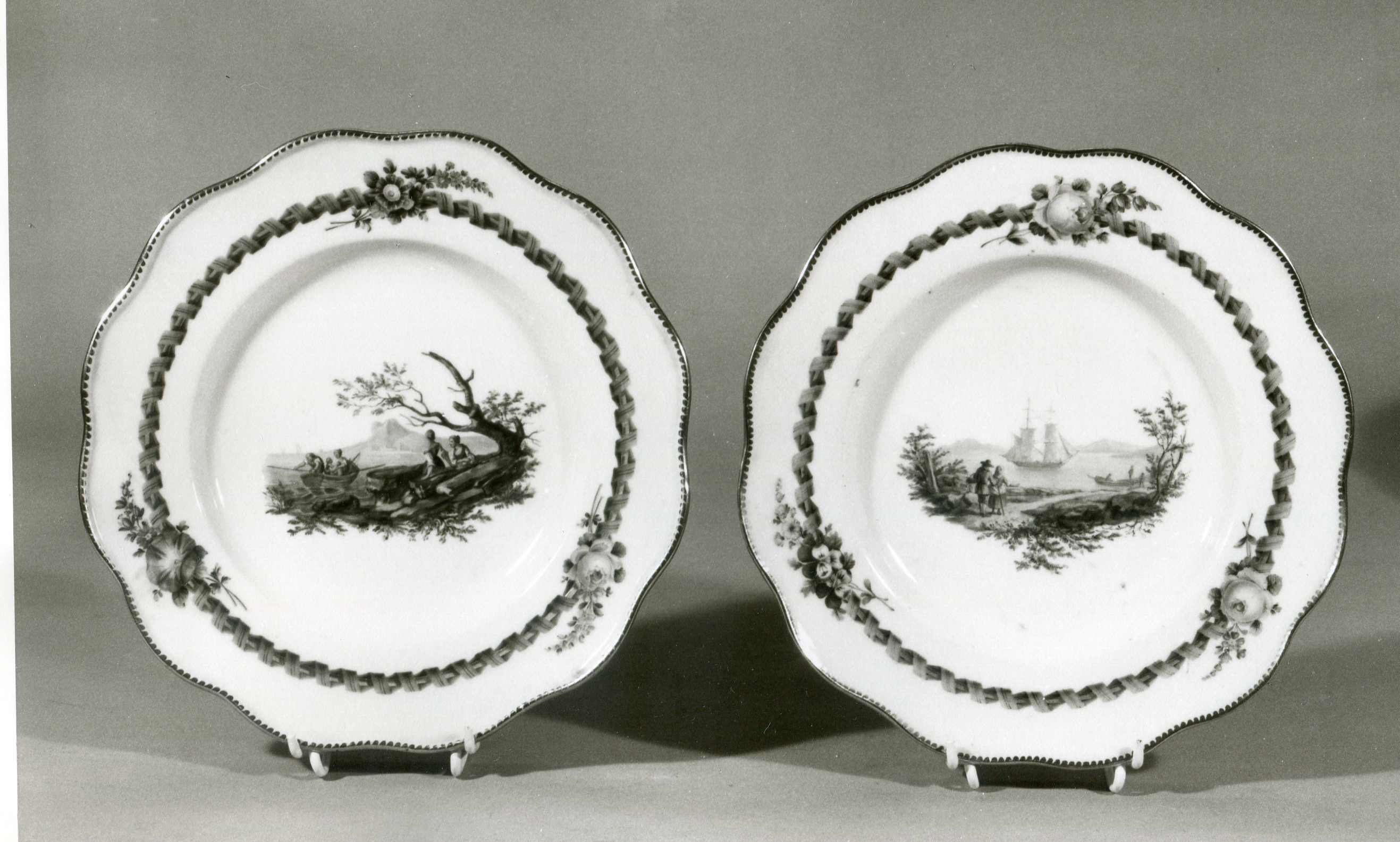 Sul primo piatto è raffigurato un paesaggio marino con barca, figure e promontorio; sul secondo piatto compare un paesaggio marino con nave, barca e figure. Le raffigurazioni sono inserite entro una cornice con motivo decorativo a nastro e floreali