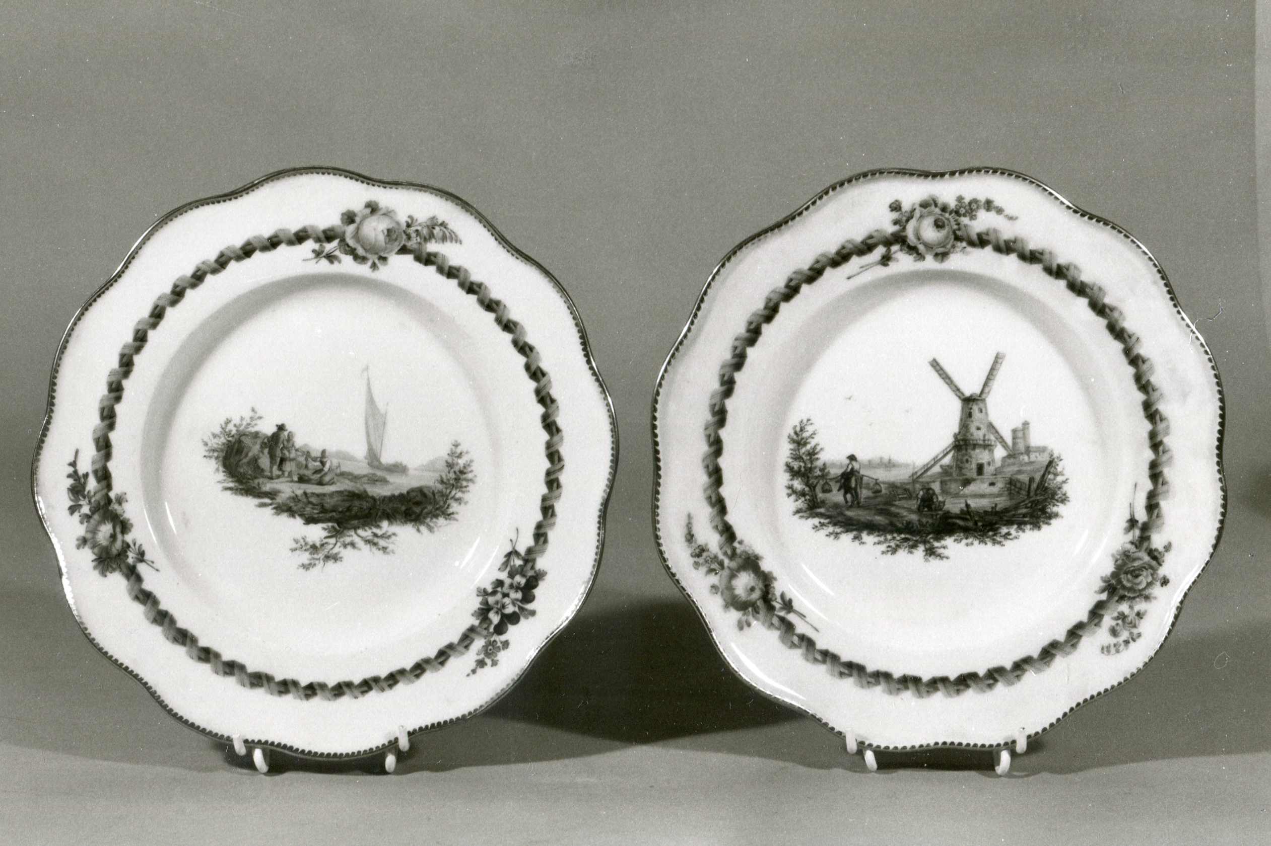 Sul primo piatto è raffigurato un paesaggio marino con nave, figura maschile e due lavandaie; sul secondo piatto compare un paesaggio marino con mulino e due figure che trasportano cesti. Le raffigurazioni sono inserite entro una cornice con motivo decorativo a nastro e floreali