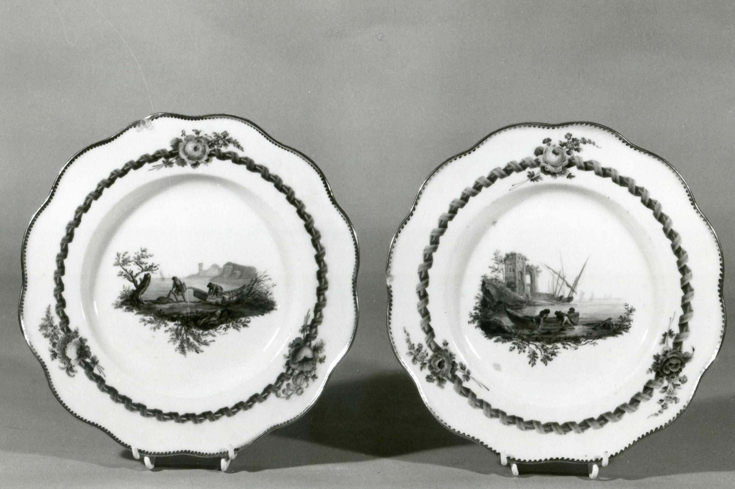 Sul primo piatto è raffigurato un paesaggio marino con barca, faro e pescatori; sul secondo piatto compare un paesaggio marino con rovina, nave, barca con pescatori. Le raffigurazioni sono inserite entro una cornice con motivo decorativo a nastro e floreali