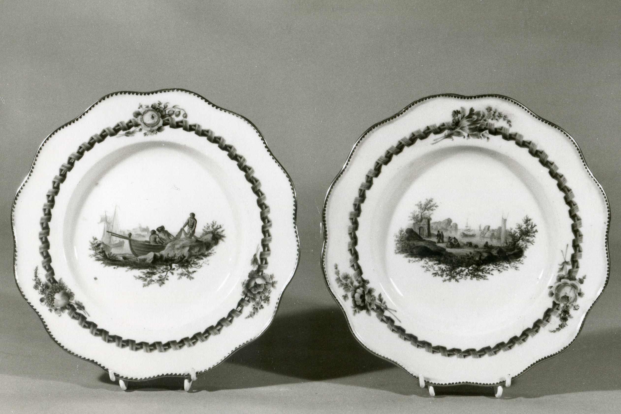 Sul primo piatto è raffigurato un paesaggio marino con navi, barca e pescatori; sul secondo piatto compare un paesaggio marino con navi, rovine e figure. Le raffigurazioni sono inserite entro una cornice con motivo decorativo a nastro e floreali