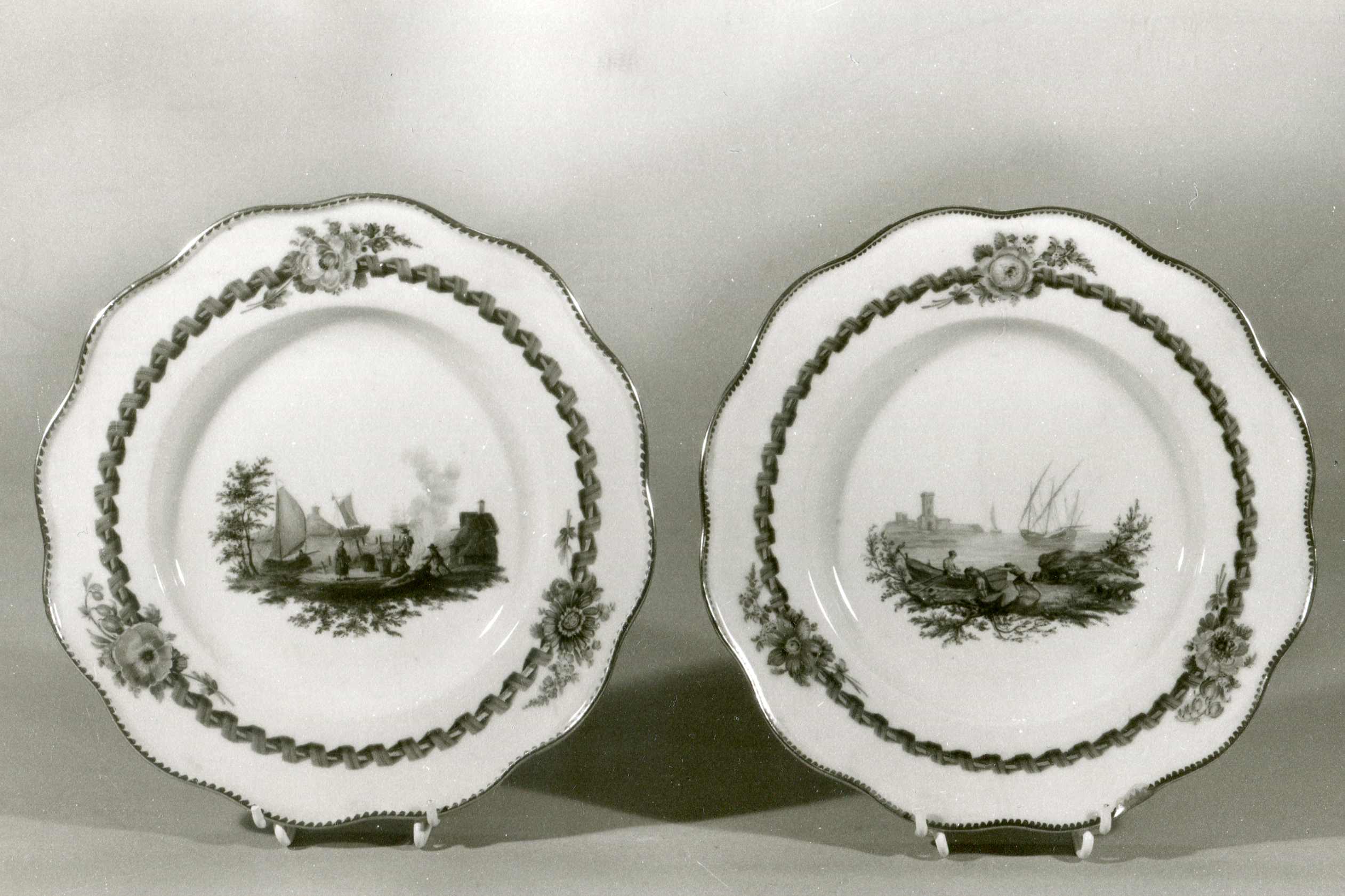 Sul primo piatto è raffigurato un paesaggio marino con scena campestre; sul secondo piatto compare un paesaggio marino con barche e velieri, figure in primo piano. Le raffigurazioni sono inserite entro una cornice con motivo decorativo a nastro e floreali. Decorazione eseguita con smalti policromi