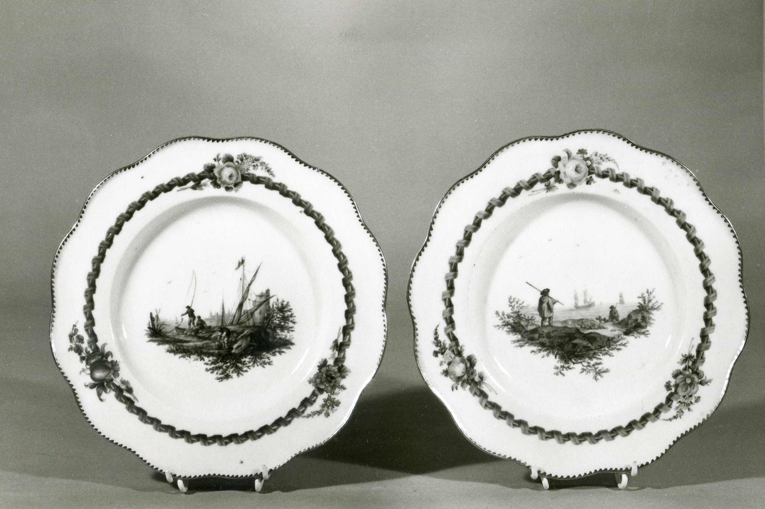 Sul primo piatto è raffigurato un paesaggio marino con nave e pescatori; sul secondo piatto compare un paesaggio marino con navi e pescatori. Le raffigurazioni sono inserite entro una cornice con motivo decorativo a nastro e floreali. Pittura eseguita a smalti policromi