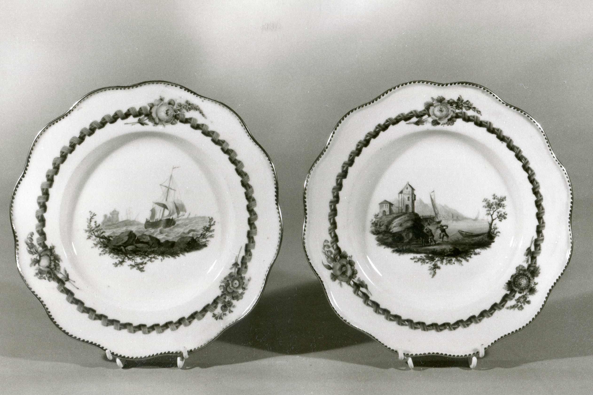 Sul primo piatto è raffigurato un paesaggio marino con nave e edificio in lontananza; sul secondo piatto compare un paesaggio marino con navi, casa sulla sinistra e figure che trasportano merce. Le raffigurazioni sono inserite entro una cornice con motivo decorativo a nastro e floreali. Decorazione pittorica eseguita a smalti policromi