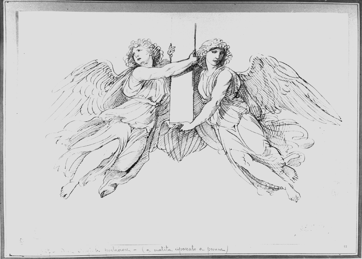 - NOTIZIE STORICO CRITICHE Il disegno è uno studio per l'affresco eseguito da Appiani verso la fine degli anni '80 del XVIII secolo sull'arco dell'altare maggiore della chiesa parrocchiale di Robecco sul Naviglio. Il disegno faceva parte della collezione privata di Giuseppe Vallardi che, intorno al 1820 ordinò in album ben 344 disegni di Appiani. L'album, di formato atlantico, pervenne all'Accademia di Brera nel 1875 per donazione di E. Cernuschi, allora residenta a Parigi, dove lo acquistò nel 1856-1860 (periodo in cui a Parigi si tennero aste di vendita di opere di provenienza Vallardi)