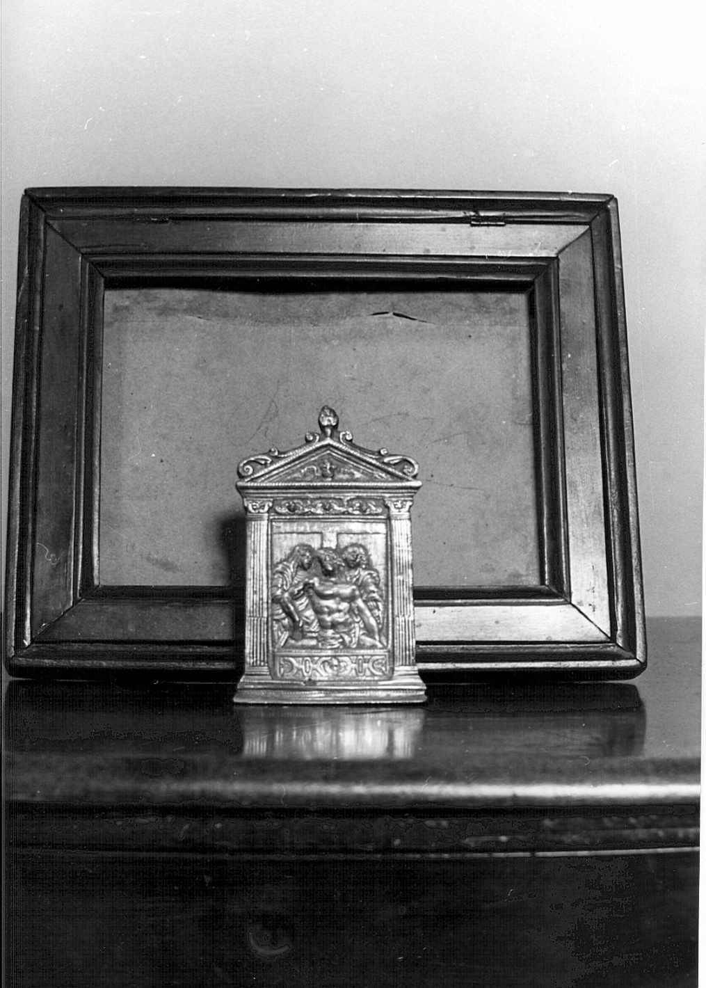 La figurazione si inquadra in una cornice a Pace, con lesene ioniche e timpano triangolare, entro cui vi è una testa di cherubino. Sul retro è saldato un sostegno a voluta