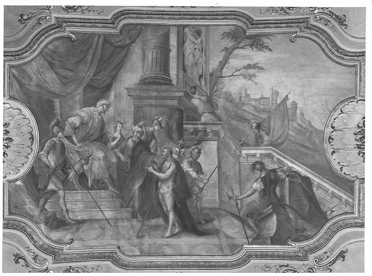 Personaggi: San Giovanni Battista; Erode; Erodiade. Figure maschili: soldati; sapiente. Paesaggi: paesaggio con città. Elementi architettonici: scalinata; trono; colonna. Sculture: statua. Armi: lance. Oggetti: libro; stendardo. Attributi: (San Giovanni Battista) veste di pelli; bastone crociato; cartiglio