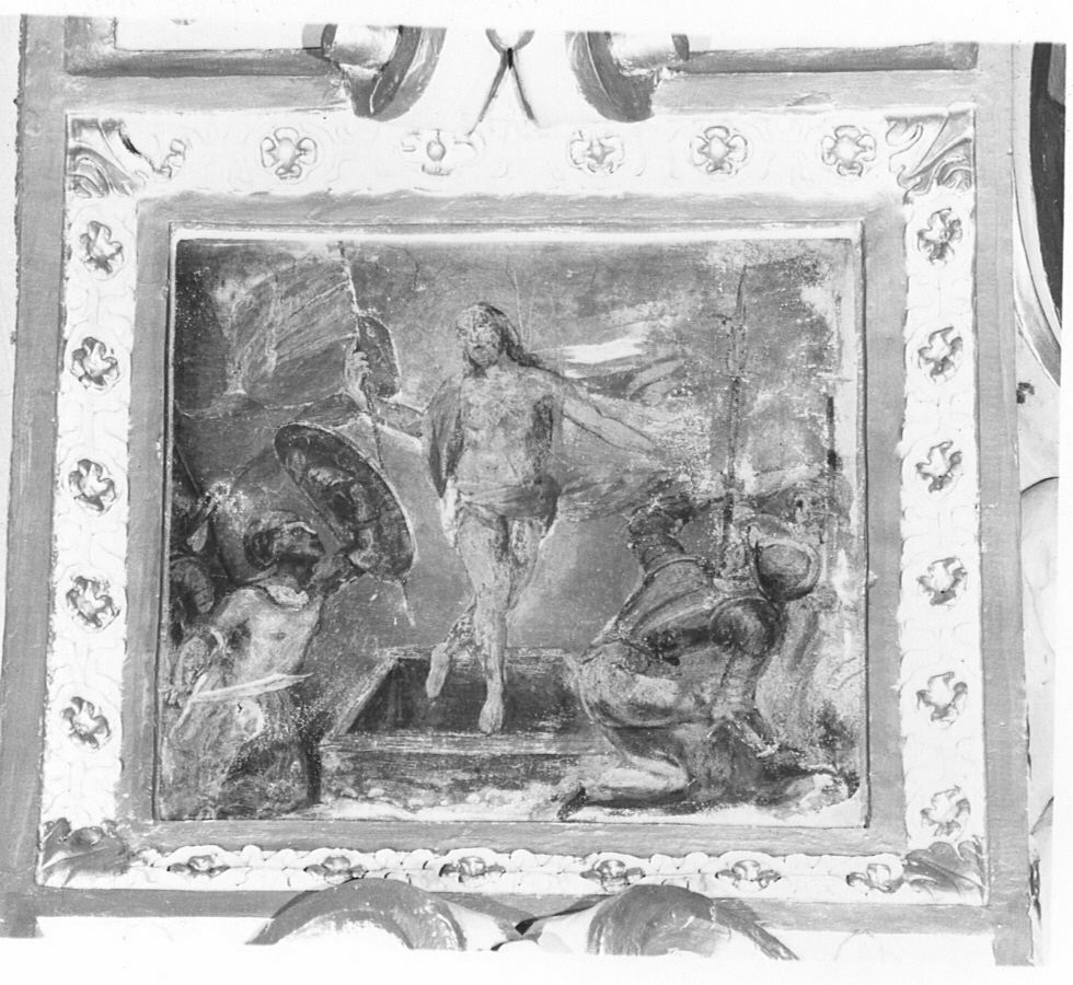 Le tonalità cromatiche-pittoriche risultano spente: variano nella gamma del grigio e del giallo ocra, ad eccezione dello scudo metallico della guardia a sinistra. L'iconografia segue lo schema tradizionale della Resurrezione dal sepolcro tra lo sbigottimento delle sentinelle