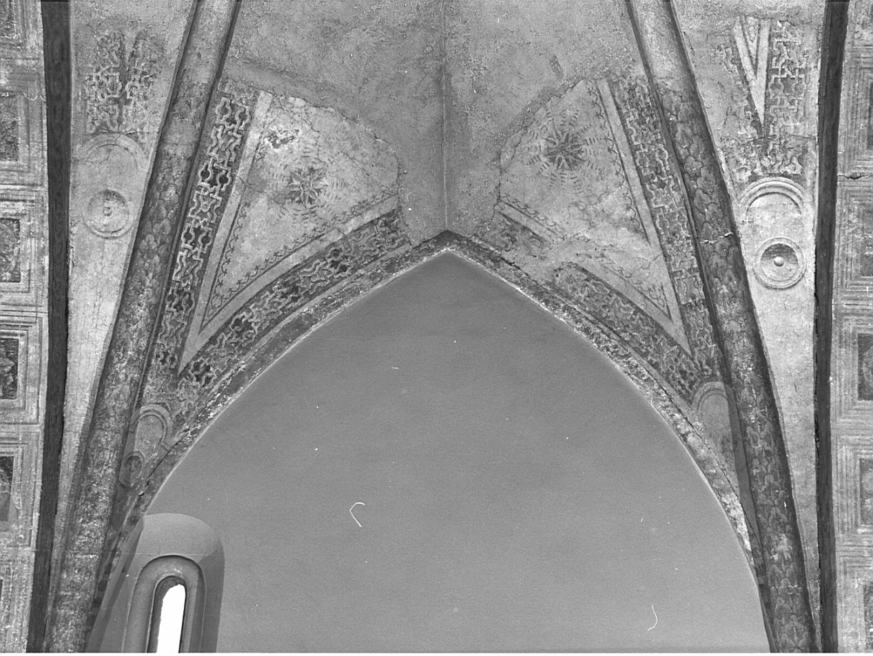 - NOTIZIE STORICO CRITICHE Il Carotti (1896) e il Reggiori (1941) assegnano la decorazione della volta al 1480, rioscontrandovi elementi stilistici fra il celtico, l'arabo, l'italo bizantino e il cosmatesco, il Carotti, mentre il Reggiori si limita "a reminiscenze arabo-sicule". "Ma le analoghe decorazioni potevano essere più semplicemente recuperate da repertori trecenteschi lombardi" (A. R. , 1995). La decorazione della volta fu recuperata, tra il 1892 e il 1896, sotto vari strati di scialbo, per volontà dell'abate mons. Comi. In seguito restaurata, la decorazione fu danneggiata dai bombardamenti nel 1943