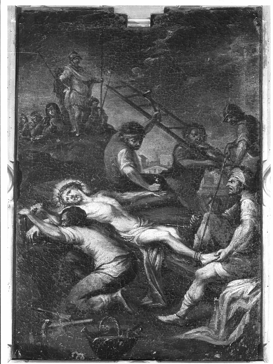 Dipinto raffigurante Gesù spogliato mentre viene inchiodato alla croce. Attorniato da vari persecutori, quello in secondo piano in vesti rosse e un altro con scala. Sullo sfondo soldati con elmi e corazze. Sfondo con vari edifici. Fondo scuro. Entro cornice di legno intagliato e dorato con decorazioni di gusto neogotico