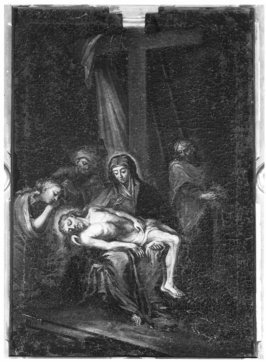 Dipinto raffigurante ai piedi della croce la Vergine, in tunica rossa e manto blu, seduta con in grembo il corpo del Figlio ormai morto. Ai lati la Maddalena dolente in bianco e rossiccio e San Giovanni a destra in piedi, in manto rosso. Fondo scuro. Entro cornifce lignea intagliata e dorata e ornata con decorazione di gusto neogotico