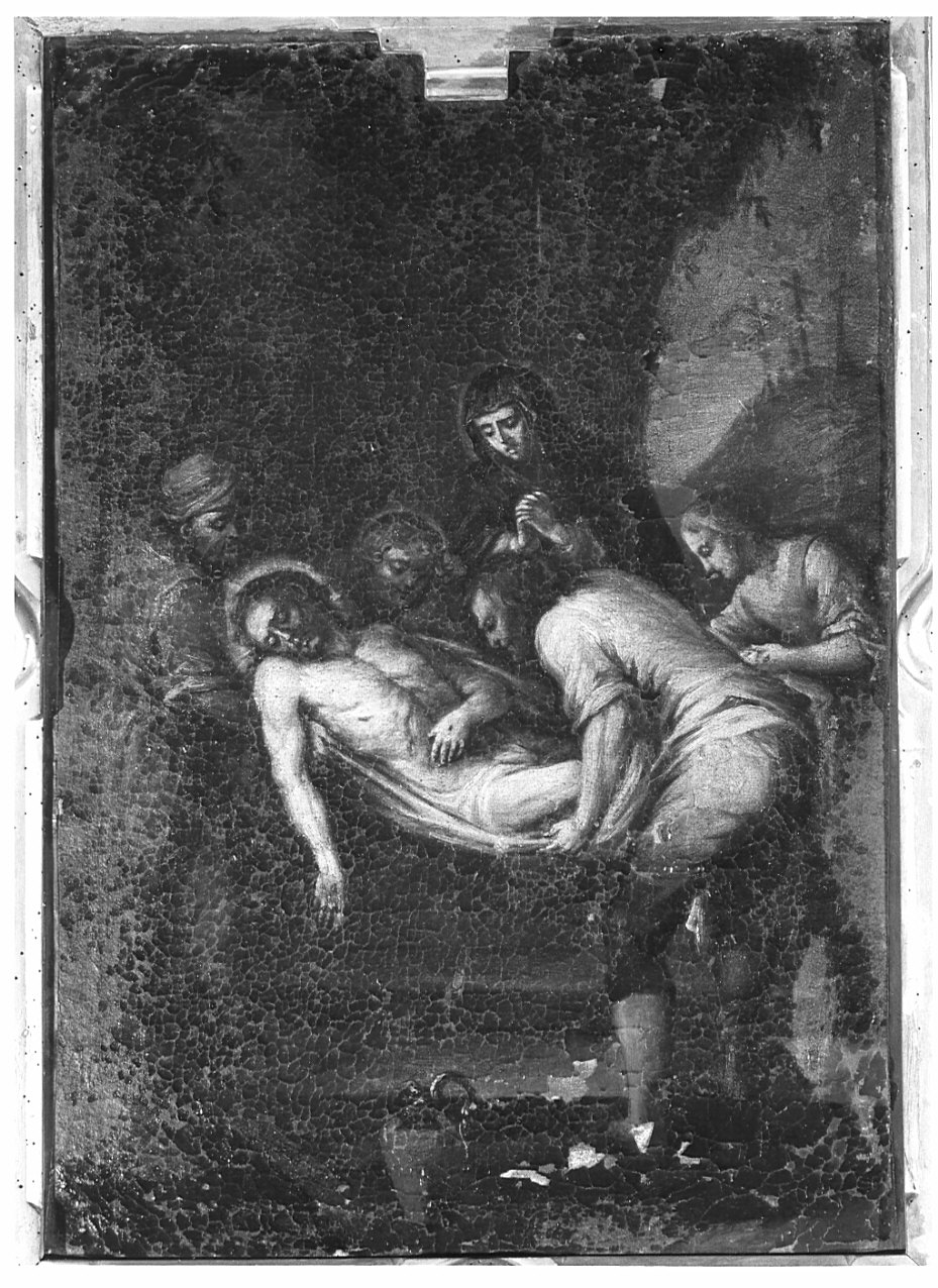 Dipinto raffigurante il corpo del Cristo ormai morto mentre viene deposto nel sepolcro da vari personaggi con vesti rosse, gialle e azzurre e dalla Vergine in secondo piano. Sullo sfondo il monte Calvario con le tre croci. Fondo scuro. Entro cornice lignea intagliata e dorata e ornata con decorazione di gusto neogotico