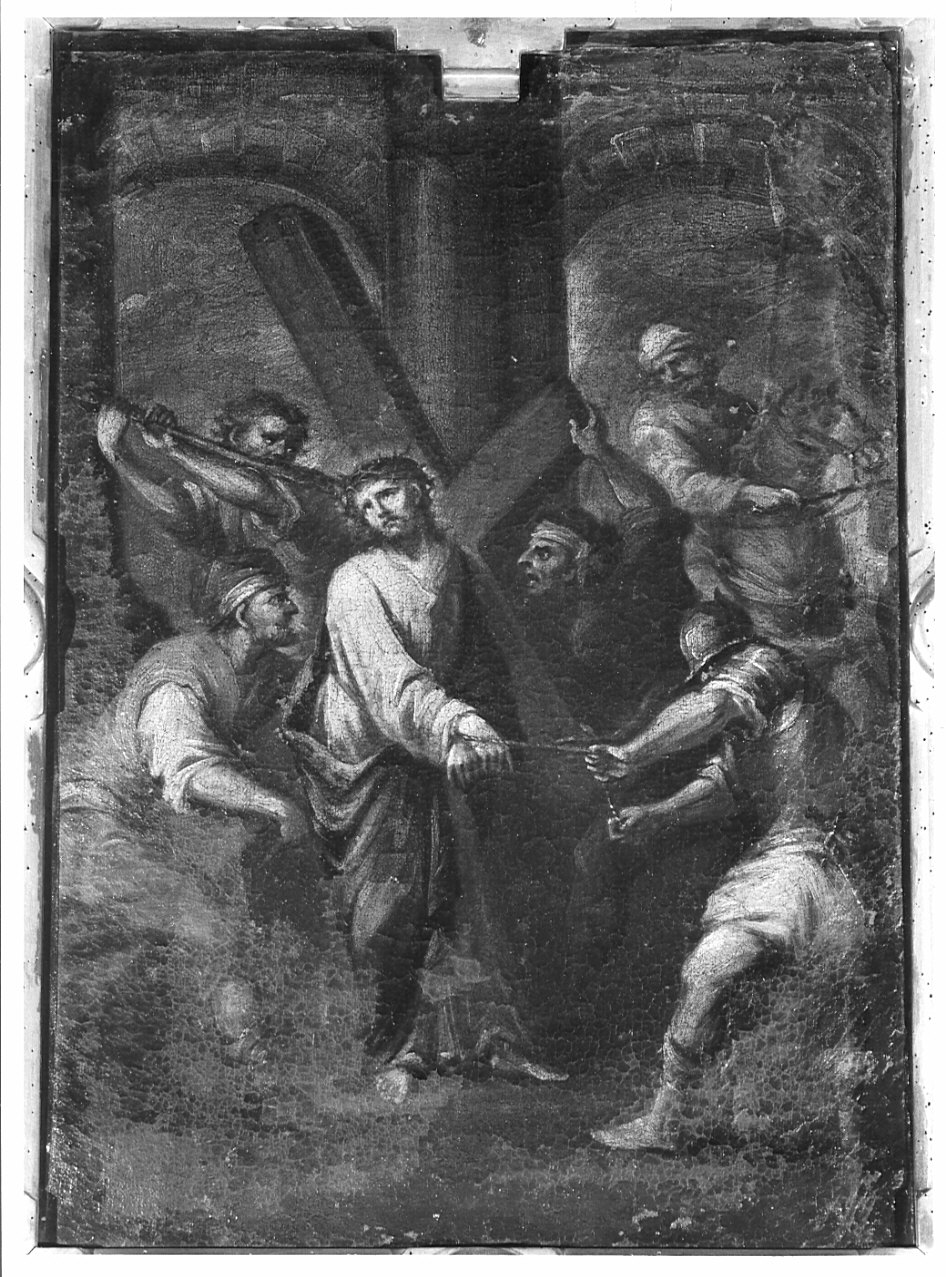 Dipinto raffigurante Gesù, in tunica rosata manto azzurro, con la corona di spine sul capo, i polsi legati, mentre vari persecutori, in vesti gialle, rossicce, grigie e azzurre, lo stanno caricando della croce. In secondo piano a destra un cavaliere con turbante assiste alla scena. Sullo sfondo archi e colonne. Toni scuri. Entro cornice di legno intagliato e dorato con decorazioni di gusto neogotico