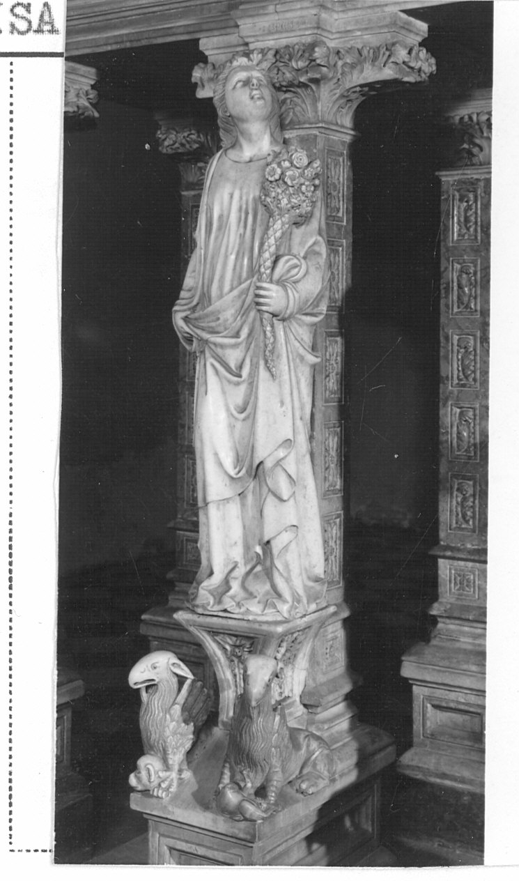 - NOTIZIE STORICO CRITICHE I gesti di queste figure sono più improvvisi e naturali e in esse anche lo Gnudi (1949) ha btrovato quei tratti acutamente espressivi che richiamano alle invenzioni vivaci del primo periodo dell'attività de maestro.Il corpo di S. Pietro, tolto dal primitivo sarcofago di marmo, apprestatogli subito dopo la morte (1253) dall'arcivescovo Leone da Perego, fu chiuso nella nuova arca dall'arcivescovo Giovanni Visconti nel 1340. Fin dal 1340 l'arca di S. Pietro era collooata tra la quarta e la quinta campata della navata sinistra. L'Allegranza (1784) annota inoltre che "serrò poi all'intorno questo mausoleo il Duca Filippo Maria nel 1424 con un ampio recinto marmoreo di 84 colonnette bianche e rosse e dentro vi fece orifece anche il pavimento di marmi bianchi e neri". G. Visconti aveva separato la testa del Santo dal busto, portandola dapprima in Castello e poi restituendola "in un prezioso tabernacolo" di cristalli che fu custodito in sacrestia fino al 1650, quando il capo fu portato nella cappella Portinari. Solo nel 1736 si provvide a una sistemazione dell'arca, a cui aveva già pensato Cristoforo Lombardi fin dal 1537 (Latuada 1131) quando fu trasportata nella cappella (ma andò distrutto il recinto marmoreo eretto nel 1424). Nel 1815, al termine dei lavori di restauro della cappella fu ancora spostata e dopo la rimozione dell'altare barocco che le stava davanti. Infine smontata durante l'ultima guerra fu ricomposta e ricollcata in situ. Il mausoleo fu commissionato nel 1335; dai Padri Domenicani e fu "disegnato, lavorato e finito da Giovanni di Balduccio 1339 col prezzo di circa duemila ducati d'oro dei quali CCC furono mandati da Ugo IV e Alisia Re e Regina di Cipro; e da un nobile ciprioto; altri C da Matteo Orsini Cardinale Domenicano; L da Giovanni Visconte Vescovo di Novara, che in appresso fu poi arcivescovo di Milano; altri L da Azzone Visconte Signor di Milano con sessanta carra di calcina per li fondamenti e per la base sopra cui l'arca doveva innalzarsi, con XX di più per le indorature, e finalmente XXX da un certo Erasmo Boggia Notaio dell'officio di Provvisione di questa città oltre ad altri Milanesi e Forestieri" (Allegranza 1841). Onorando con uno sfarzoso monumeto il martire, il cui culto andava sempre più diffondendosi, i Padri Domenicani intendevano compiere un atto di politica religiosa ed affermazione di potenza dell'ordine che concordava con i programmi dei Visconti, i quali con grandiose iniziative d'opere civiche e di mecenatismo culturale, volevano dimostrare il prestigio della loro Signoria. La realizzazione venne allora affidata nel 1335 a G. B., nativo di Pisa, operante a Milano sembra già dal 1334, scultore di fiducia di Castruccio Castracani, amico di Azzone Visconti, e già conosciuto dai Domenicani per il monumento funebre del 1324-25 per il figlio di Castruccio Castracani, Guarnerio degli Antelminelli e per il pulpito della Chiesa di S. M. del Prato a S. Casciano (1330). Aiutato ma nello stesso tempo condizionato dal contratto che esigeva la fedeltà al modello nicoliano di S. Domenico di Bologna e che imponeva la struttura iconografica secondo i temi agiografici dello Pseudo Dionigi, G. B. realizzò con la collaborazione di aiuti, una ripresa dell'arca bolognese con la sola modifica forse del coronamento del tabernacolo ma con un'adesione al modello nicoliano solo esteriore