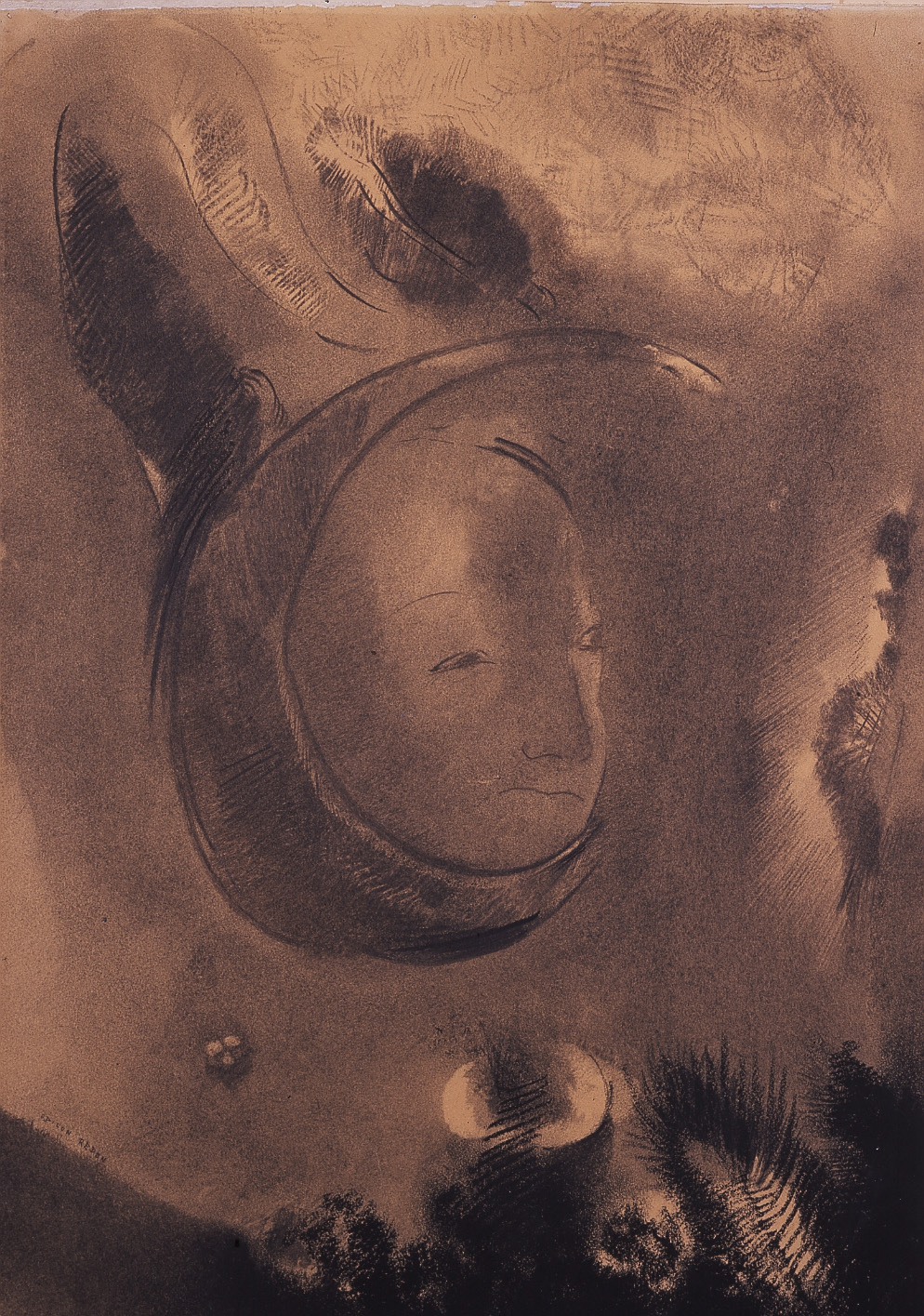 - NOTIZIE STORICO CRITICHE Lamberto Vitali, che amava la grafica in tutti i suoi aspetti ed è stato un grande conoscitore e storico dell'incisione, ha avuto una fortissima predilezione per il simbolista Odilon Redon, artista solitario e segreto, maestro insuperato di noirs e di ombres. In una linea ideale di pensiero Redon per lui era pari a maestri grandissimi, altrettanto amati, come Rembrandt e Goya. Questa passione è documentata non solo dall'acquisto fatto a Parigi nel 1949 dal mercante Robert Lebel del fusion ora a Brera ma anche dalla presenza nella sua biblioteca di rarissimi volumi come la costosa edizione del 1933 curata da Ambrose Vollard delle celebri litografie dedicate al dramma simbolista di Gustave Flaubert La tentation de Saint Antoine, la elegantissima edizione Lettres d'Odilon Redon 1878-1910 pubblicate nel 1923 a Parigi e Bruxelles per la Librairie National d'Art e d'Histoire, i fondamentali e introvabili scritti di André Mellerio, amico e storiografo dell'artista, tra i quali spicca il volume Odilon Redon stampato nel 1913 per la Societè pour l'Etude de la Gravure Francaise, ma anche le splendide riproduzioni e stampe raccolte in Redon: Fusains di Claude Roger Marx (Editions Braun, Paris 1950). Misterioso e ambiguo il disegno a carboncino, nerissimo e vellutato, con il grande volto tondo e un poco maligno, che affiora appeso a uno spicchio di luna nel buio di una notte universale e interiore, popolata da un microcosmo fluttuante, trova un commento perfetto nelle parole stesse di Redon che Vitali certo ben conosceva e aprezzava per concretezza di visione: "Vers 1875, tout m'arriva sous le crayon, sons le fusain, cette poudre volatile, impalpable, fugitive sous le mains. Et c'est alors que ce moyen, parce qu'il m'exprimait mieux, me resta. Cette matière quelconque, qui n'a aucune beauté en soi, facilitait bien mes recherches de clair-obscur et de l'invisible. C'est une matière mal vue des artistes et négligée. Que je le dise pourtant, le fusain ne permet pas d'être plaisant, il est grave. On ne peut tirer bon parti de lui qu'avec le sentiment même. Tout ce qui ne suggère pas à l'esprit quelque chose ne vaut rien qui vaille avec le charbon". (O. Redon, Confidences d'Artistes, in L'Art Moderne, Bruxelles 1894, p. 268). Il disegno, sconosciuto alla critica e scoperto da Vitali, è stato reso noto per la prima volta nella Retrospettiva che la Biennale di Venezia dedicò all'artista nel 1962 (Vitali era commissario della mostra insieme a Roseline Bacou, Franco Russoli e al figlio di Redon: Ari). A Venezia venne esposta anche la litografia La tentazione di Sant'Antonio XVII. Antonio: qual è lo scopo di tutto questo? Il Diavolo: non c'è scopo anch'essa allora di Vitali. Per un errore l'etichetta con il titolo flaubertiano fu applicata sul verso del fusain dove è ancora oggi leggibile