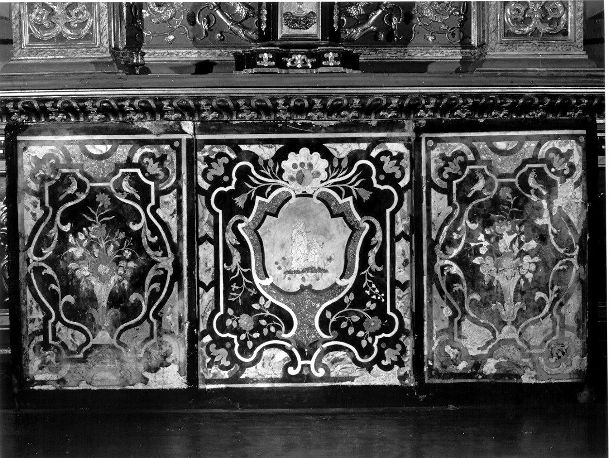 scompartito in tre pannelli rettangolari, di cui quello centrale con specchiatura mistilinea e raffigurazione di Sant'Anna con Maria bambina, quelli laterali con vaso di fiori