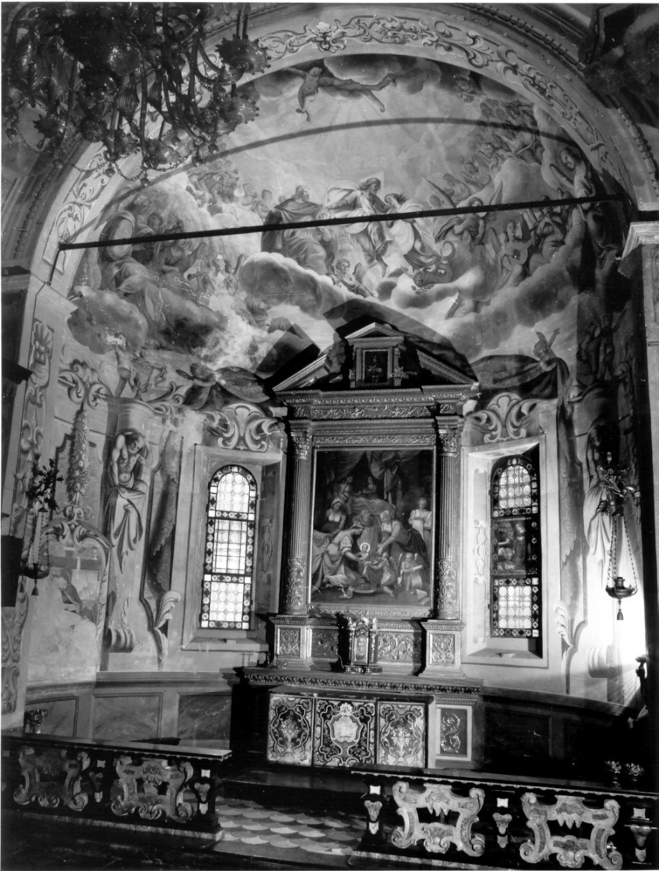 Decorazioni: finte architetture; festoni di foglie e frutta; telamone; finto pilastro. Figure: angeli