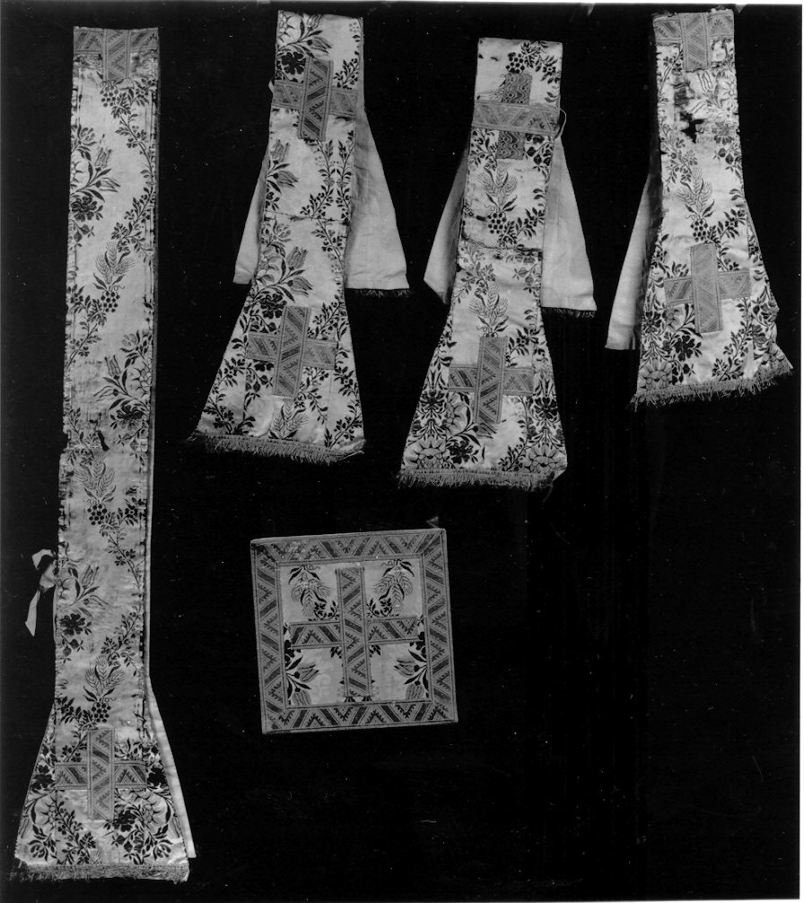 Il fondo del tessuto, di color grigio perla, è decorato da un motivo nastriforme speculare che dà forma a grandi losanghe alternate a più piccoli rombi sovrapposte ad un motivo di raso liseré. Spighe di grano, con grappoli d'uva, si svolgono verticalmente alternti a piccoli miosostis. Nel mezzo della losanga è inglobata una composizione con pigna al centro e tulipani laterali e altre semplici corolle. La policromia sottile del disegno cre un ricco seppur leggero intreccio di rosa fuscsia, rosa, giallo e verde ben equilibrati. Le fodere e i galloni dorati sono originali a lavorazione geometrica