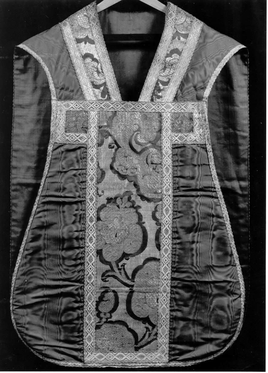 Il paramento è composto da un piviale, una pianeta, due tunicelle e una borsa. Il paramento è piuttosto ricco e complesso. Tutti gli elementi sono stati restaurati, riportando sopra un tessuto di raso marezzato color rosa, mentre le parti antiche su un fondo in raso viola presentano broccature in fili d'oro e d'argento ritorti. Il motivo del disegno non è certamente leggibile: si nota una successione di grandi maglie curvilinee definite da volute, e diverse tipologie di vegetali tra le quali si possono riconoscere mature peonie e una ricca composizione di una sorta di foglie d'acanto con il contorno tondeggiante. Tutto il parato è completato da un gallone dorato a losanghe alternate con effetto pieno e vuoto