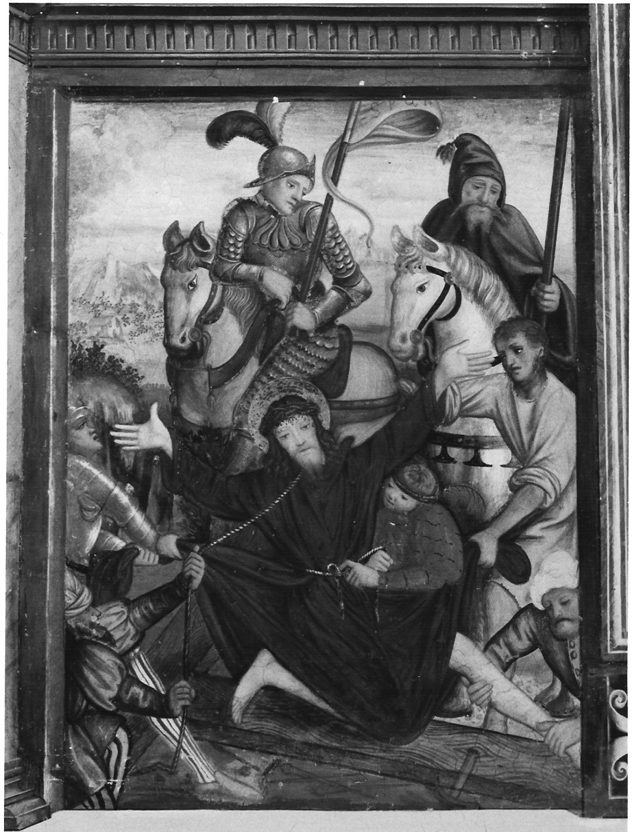 Personaggi: Cristo. Figure: soldati. Abbigliamento: uniformi militari. Oggetti: croce; insegne. Animali: cavalli. Paesaggi