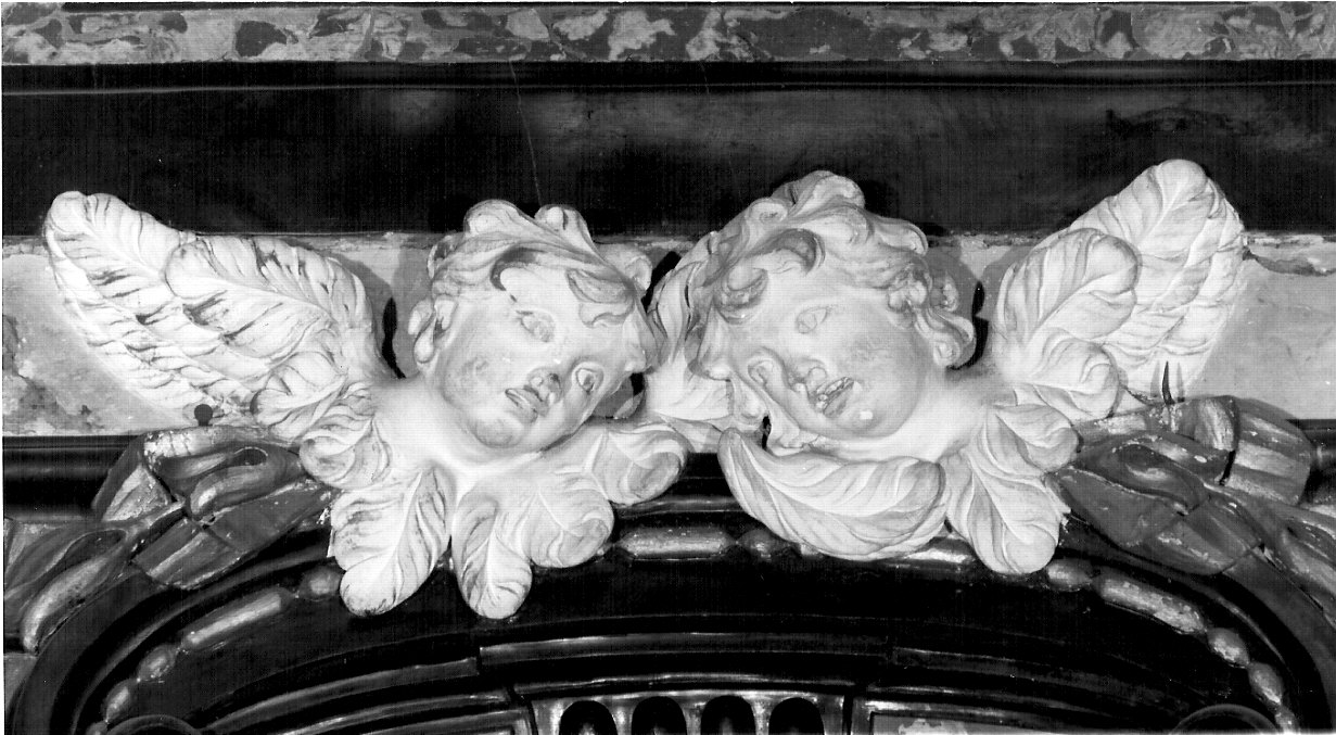coppia di cherubini le cui ali sono delle piume che circondano i rispettivi capi con capigliatura riccioluta