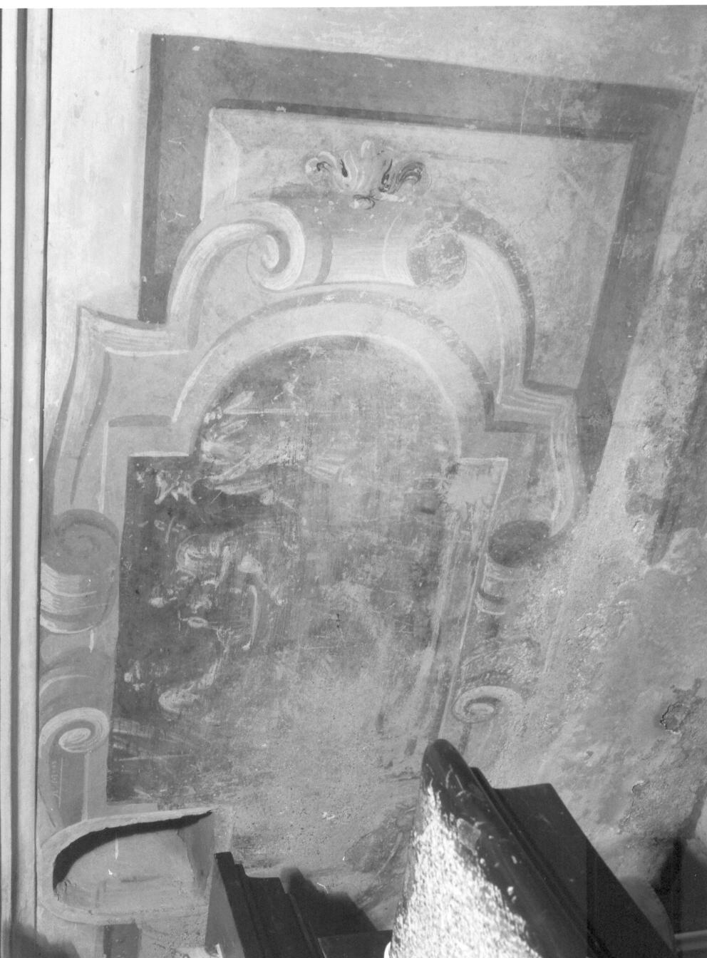 Affresco entro cornice rettangolare, lobata sui lati corti. Una nicchia aperta successivamente interrompe il dipinto sul lato sinistro