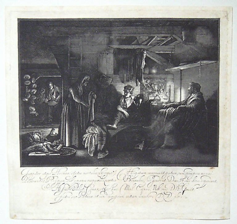 - ISCRIZIONI nel margine inferiore - JUPPITER ATQUE HERMES SPETIE MORTALIS SERQUE / LUSTRANTES L CRYGIAM, SUB AMOENA CREPUSCULA MOETIS / HOSPITIUM INVENIUNT GRATUM, CUM PAUPERE MENSA / BAUCIDIS, VIS GAUDINT DIUI, ET SUA DONA REPENDUNT - corsivo -