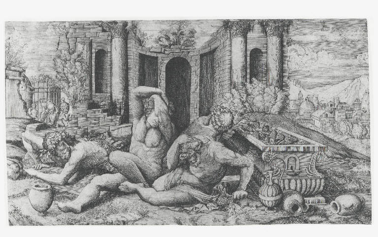 Figure: figure maschili. Frutti: grappoli d'uva. Paesaggio. Costruzioni: esedra; case; chiesa. Sculture: vasca. Oggetti: brocche; anfore