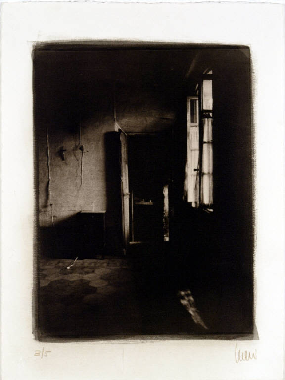 INTERNO: di stanza; MOBILIA: comodino; OGGETTI: crocifisso, tende, fili elettrici; OGGETTI: porta, finestra