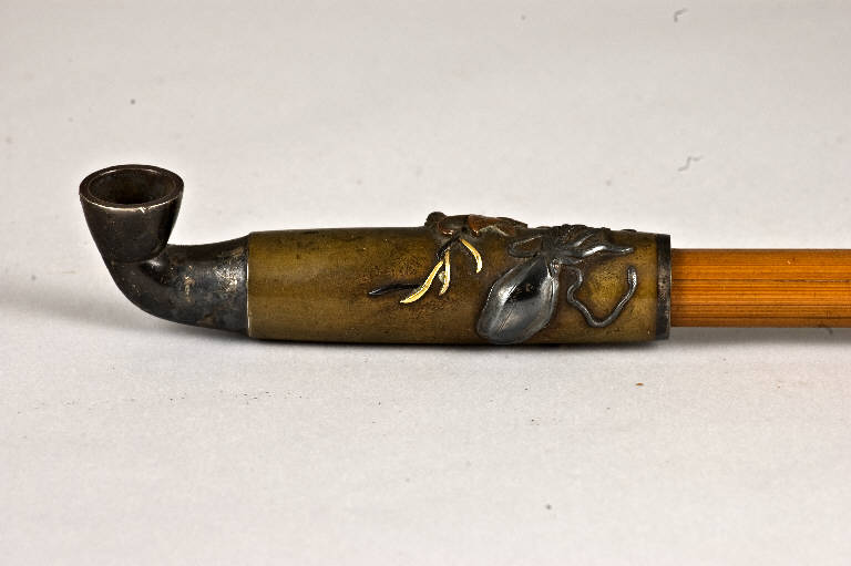 La pipa (kiseru), è lavorata in una sezione di bambù. I due estremi, l'uno con il bocchino e l'altro con il fornellino dove brucia il tabacco, sono in metallo, decorati con erbe acquatiche, pesci e molluschi in accentuato rilievo