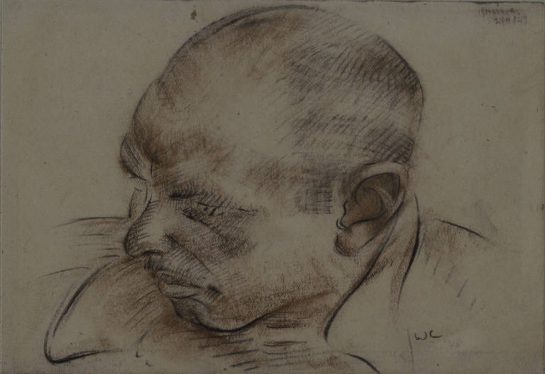 - ISCRIZIONI etichetta adesiva retro pannello alto a destra - THE FOUNDATION/ FOR IMPROVING UNDERSTANDING/ OF THE ARTS/ AUTORE WILLIAM CONGDON/ TITOLO HEAD (AMBULANCE DRIVER)/ DATA 1943/ MISURE cm 13 x 18 CODICE d.009.00/ TECNICA MATITA SU CARTA/ DONAZIONE CONF. 15/04/1990/ FONDAZIONE COMPRENSIONE ARTI/ VIALE LOMBARDIA 10 20090 BUCCINASCO (MILANO) ITALIA Paolo Mangini - Congdon Grosvenor, William - corsivo/ lettere capitali - a penna/ a stampa -