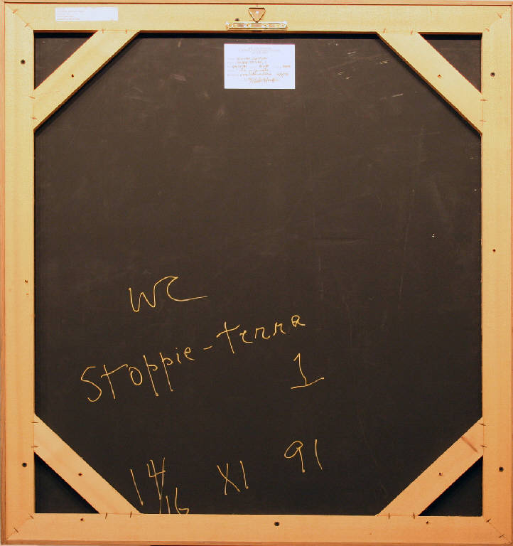 - ISCRIZIONI etichetta adesiva retro cornice in alto a sinistra - 830.00/ STOPPIE-TERRA 1 1991/ cm 90 x 80/ olio su pannello/ Collezione dell'artista - Congdon Grosvenor, William - corsivo - a penna/ a stampa -