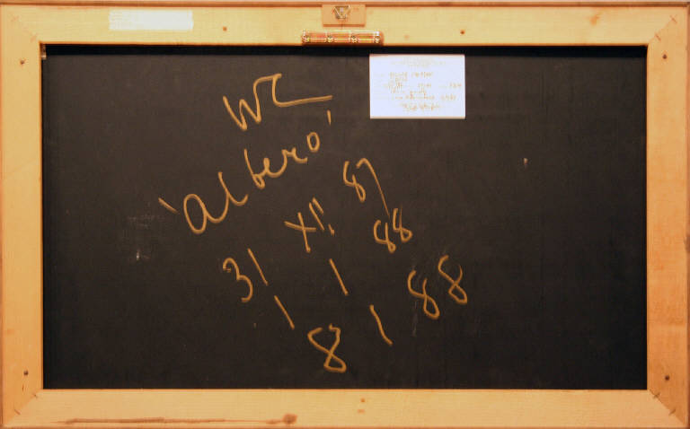 - ISCRIZIONI etichetta adesiva retro cornice in alto a sinistra - 730.00/ ALBERO 1987/ cm 50 x 80/ olio su pannello - Congdon Grosvenor, William - corsivo - a penna/ a stampa -