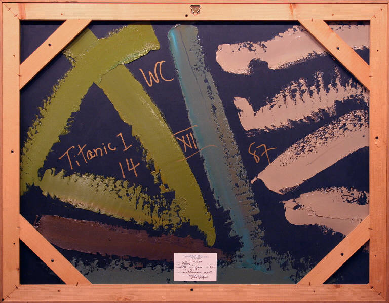 - ISCRIZIONI etichetta adesiva retro pannello basso al centro - THE FOUNDATION/ FOR IMPROVING UNDERSTANDING/ OF THE ARTS/ AUTORE WILLIAM CONGDON/ TITOLO TITANIC, 1/ DATA 14/XII/87/ MISURE cm 80 x 100 CODICE 726.10/ TECNICA olio su pannello/ DONAZIONE x via testamentaria 15/01/99/ FONDAZIONE COMPRENSIONE ARTI/ VIALE LOMBARDIA 10 20090 BUCCINASCO (MILANO) ITALIA Paolo Mangini - Congdon Grosvenor, William - corsivo - a penna/ a stampa -